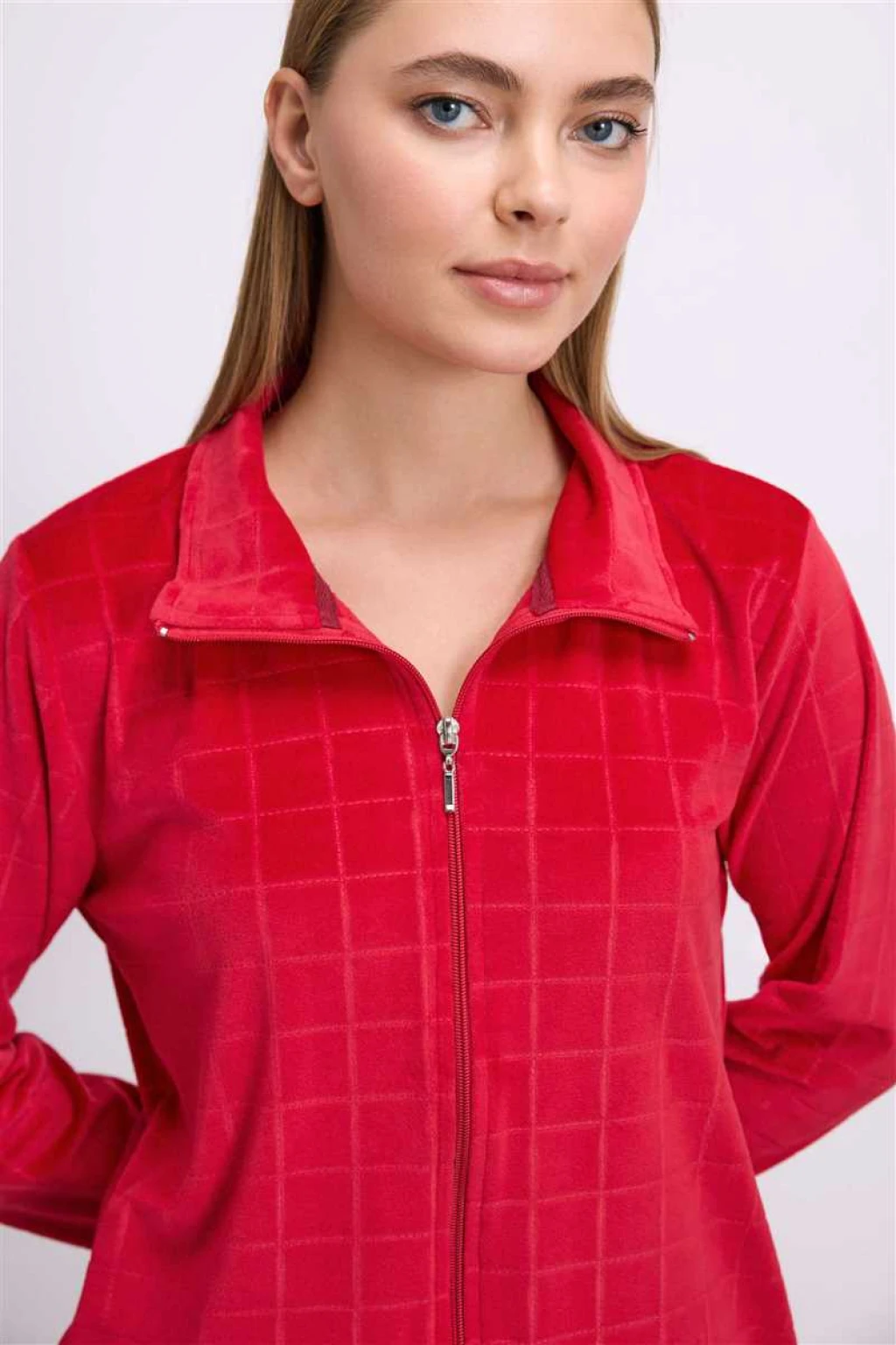 11565 Kadın Uzun Kol Sweatshirt ve Pantolon Takımı, zarif kırmızı rengiyle hem şık hem de konforlu bir görünüm sunuyor. Kadife dokusuna sahip yumuşak kumaşı, gün boyu konfor hissi sağlar. Fermuarlı üst kısmı sayesinde pratik bir kullanım imkânı sunarken, düz kesim pantolonu rahat bir oturuş ve hareket özgürlüğü sağlar.Ürün, %92 polyester ve %8 elastan karışımından üretilmiştir. Bu özel kumaş oranı, ürüne dayanıklılık, esneklik ve formunu koruma özelliği kazandırır. Cilde yumuşak bir şekilde temas eden kumaş, iç mekanlarda konforlu bir kullanım sunarken soğuk havalarda sıcak tutar. Evde dinlenme, misafir ağırlama veya rahat gezilerde şık bir ev giyimi alternatifi olarak tercih edilebilir.Kare desenli dokusu ve sade tasarımıyla klasik tarzı modern bir yorumla buluşturan bu takım, zasız bir parça olarak gardırobunuzun favorisi olmaya adaydır.Ürün Özellikleri:Ürün Kodu: 11565Marka: Kumaş İçeriği: %92 Polyester, %8 ElastanKumaş Tipi: Kadife görünümlü, yumuşak ve esnek kumaşRenk: KırmızıModel: Fermuarlı üst + düz kesim pantolonKalıp: Rahat kesimKullanım Alanı: Ev giyimi, loungewear, günlük rahat kullanımSezon: Sonbahar / KışBakım: 30°C’de hassas yıkama, düşük ısıda ütüleme önerilirÖne Çıkanlar:✔ Yumuşak ve sıcak tutan kadife dokulu kumaş✔ Esnek yapısıyla rahat hareket imkânı✔ Fermuarlı tasarımıyla pratik ve modern görünüm✔ Şık kırmızı rengiyle enerjik stil✔ Günlük ev konforunda şıklık arayanlar için ideal