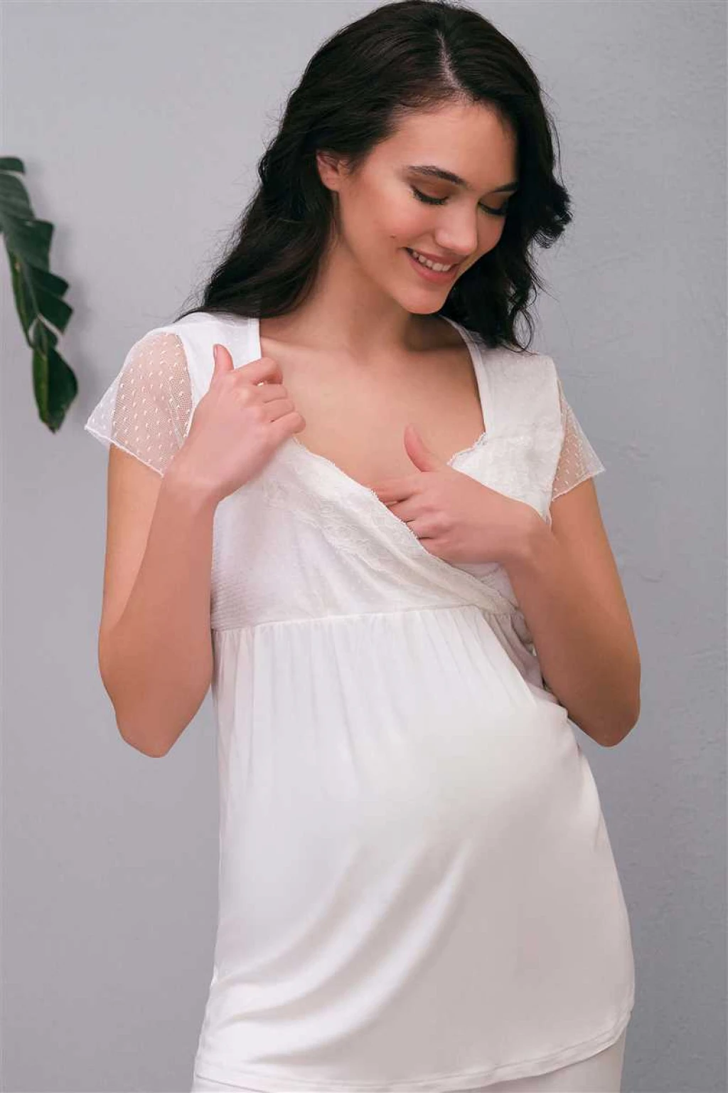 Kısa Ad:Kadın Viskon Hamile Lohusa Dantelli Sabahlık Önden Açılan Emzirme T-Shirt ve Pantolon Pijama 3'lü Takım (5648)