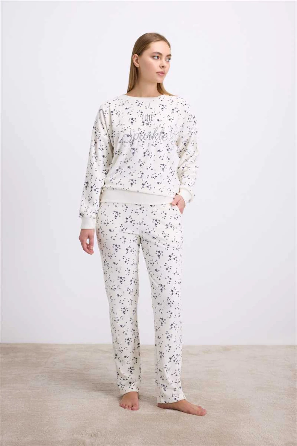 Parlayan detaylarıyla zarafeti konforla buluşturan 11592 takımı, “I love to sparkle” sloganı ve yıldız desenleriyle gecelerinize sıcaklık, tarzınıza ışıltı katıyor. Doğal liflerle zenginleştirilmiş Tencel™ kumaşın yumuşak dokusu sayesinde cildiniz nefes alır, siz ise gün boyu rahatlığın keyfini yaşarsınız.Üst parça, sade ama etkileyici bir duruş sunan klasik sweatshirt formundadır. Yuvarlak yakası ve bilek şetleriyle konforlu bir kullanım sağlar. Göğüs kısmındaki ışıltılı yazı detayı, minimal bir şıklık sunarken içeriğindeki simli dokunuşlar feminen bir zarafet kazandırır.Alt parça, rahat kesim pantolon formu ve esnek bel bandı ile konforu tamamlar. Yumuşak kumaş dokusu, tenle temas ettiğinde huzur verici bir sıcaklık hissi yaratır. Kumaşın özel karışımı (%40 Tencel™, %40 pamuk, %20 polyester), hem dayanıklılık hem de doğal esneklik sunarak uzun ömürlü kullanım sağlar.Kış aylarında sıcak tutan, bahar akşamlarında ise hafif dokusuyla rahatlık sağlayan bu takım, “rahatlık ve zarafet bir arada” diyen kadınlar için tasarlandı.Detaylar:Ürün kodu: 11592Renk: Ekru zemin üzerine lacivert yıldız deseniKumaş içeriği: %40 Tencel™, %40 Pamuk, %20 PolyesterYuvarlak yaka, uzun kollu sweatshirt üstEsnek bel bantlı düz kesim pantolonIşıltılı “I Love to Sparkle” yazı detayıNefes alabilen, cilt dostu kumaşYumuşacık, sıcak tutan ve hafif yapı