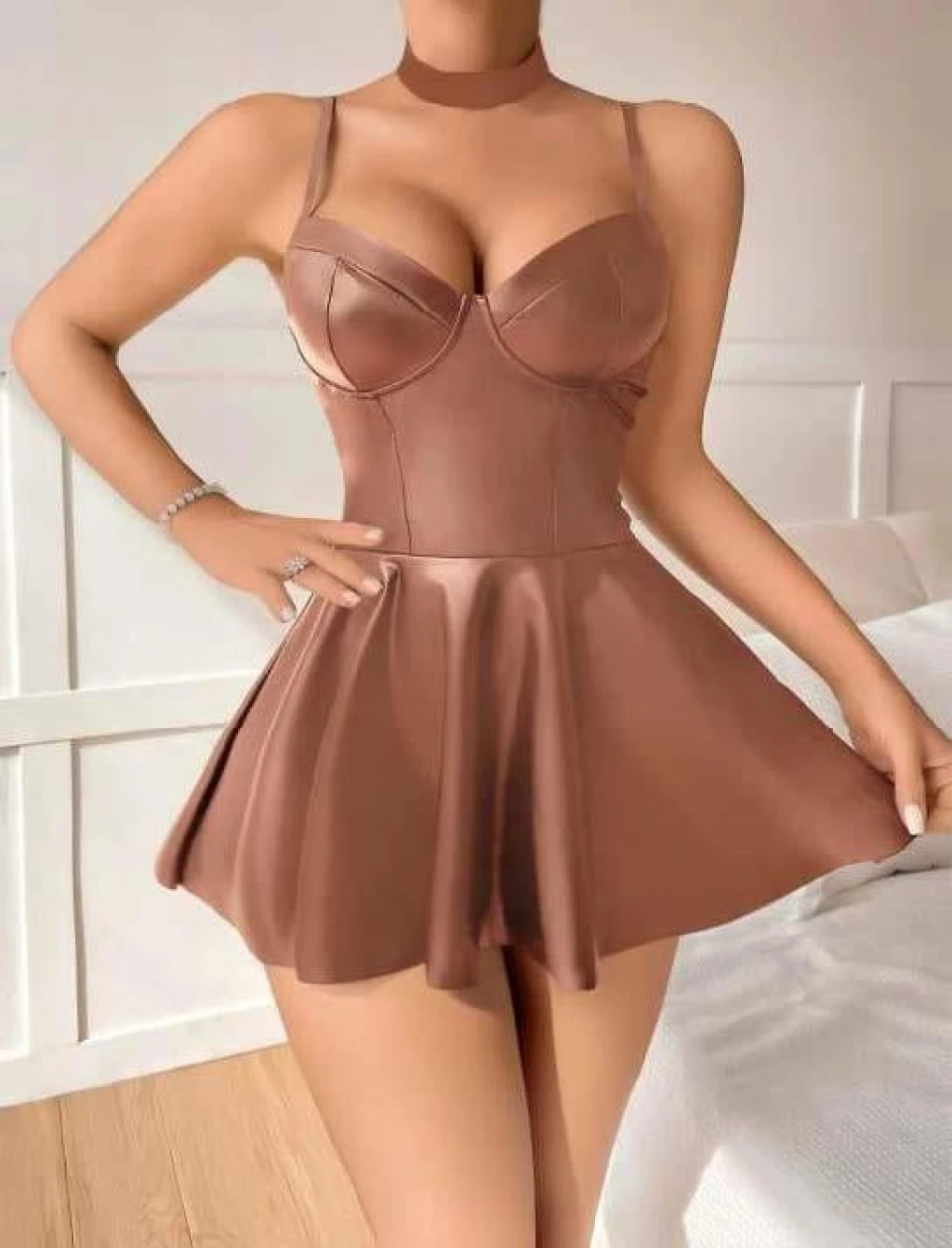 Kahverengi Etekli Pileli Fantezi Deri Elbise