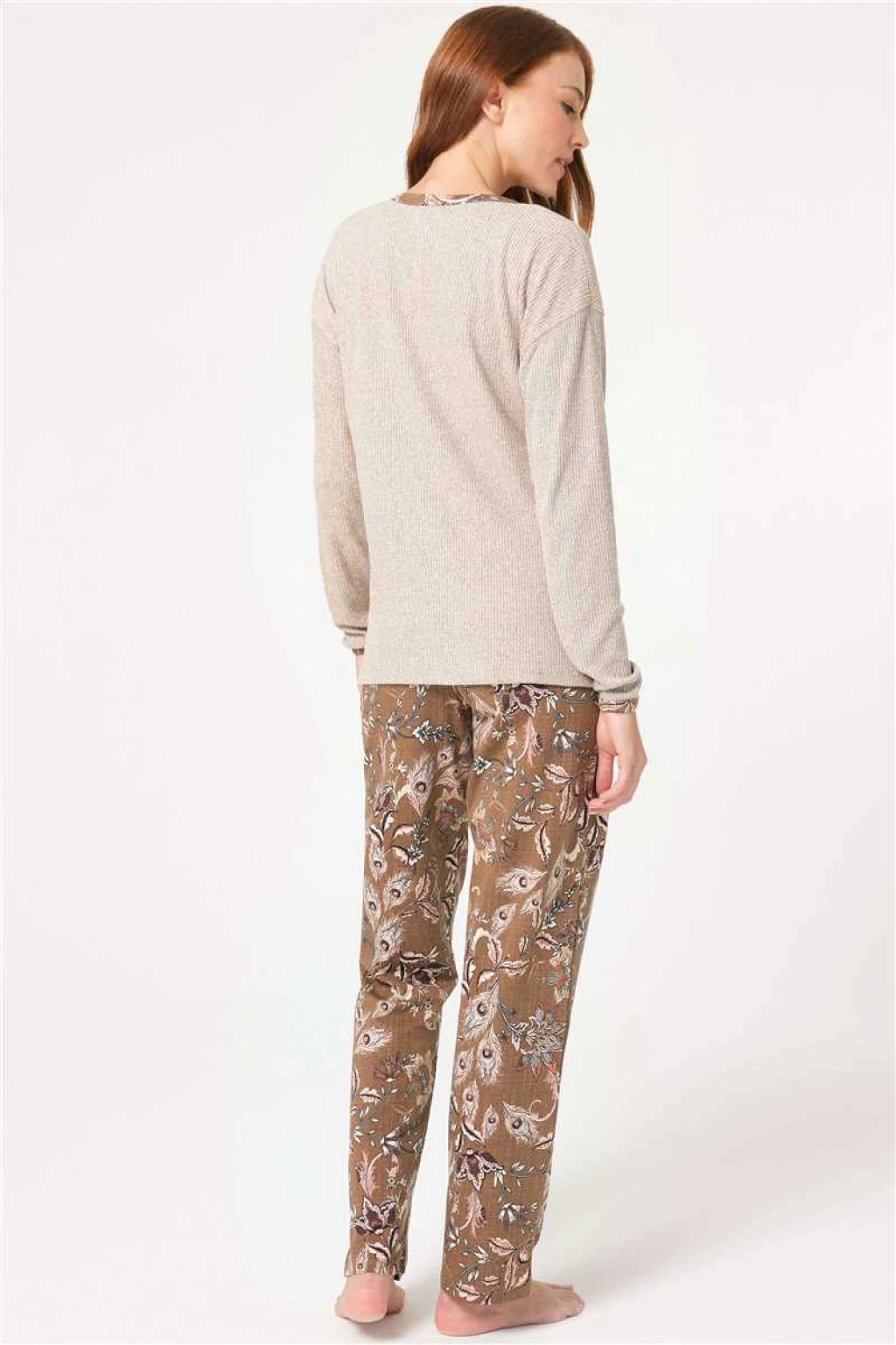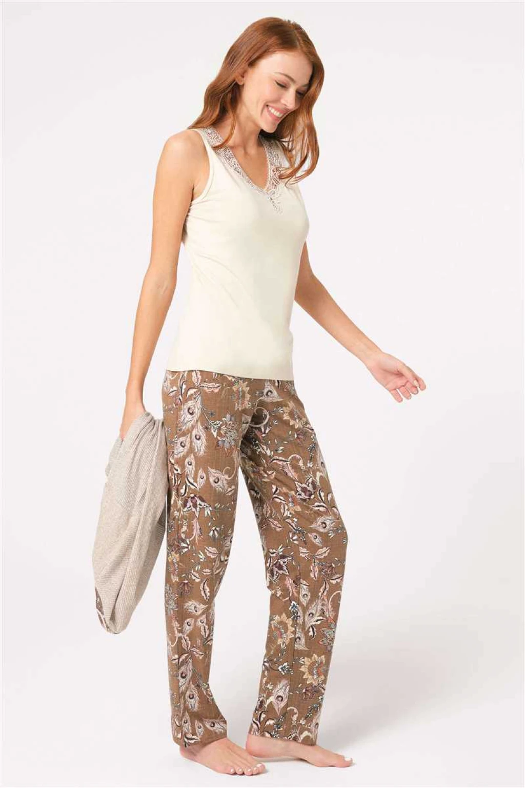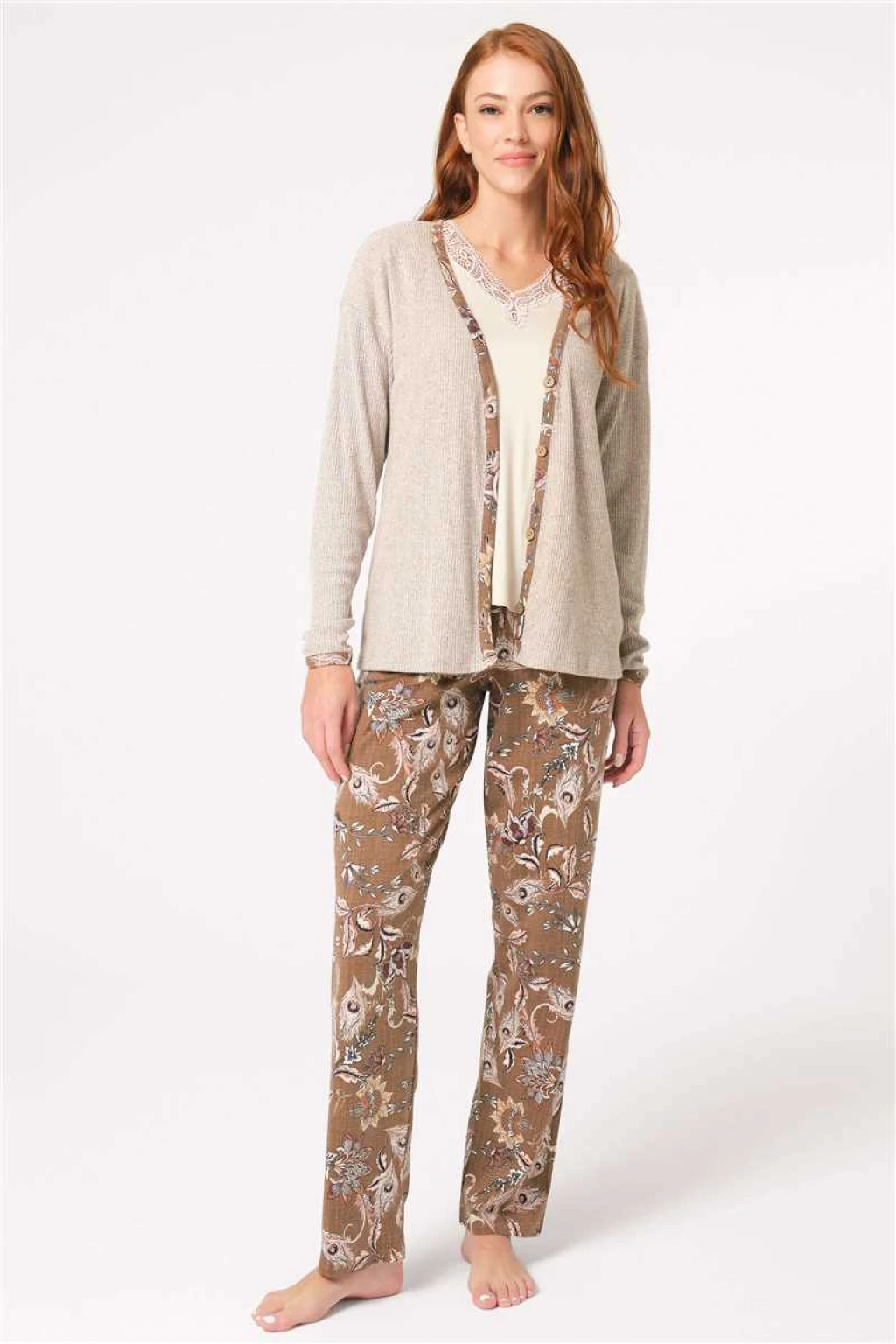 5798 Günlük Basic Ev Giyimi Kalın Askılı V Yaka Viskon Çiçek Desenli Kışlık Örme Normal Bel Uzun Diz_Altı Düğmeli Uzun Paçalı Dantel Detaylı Pijama Takımı Sabahlık modelimiz