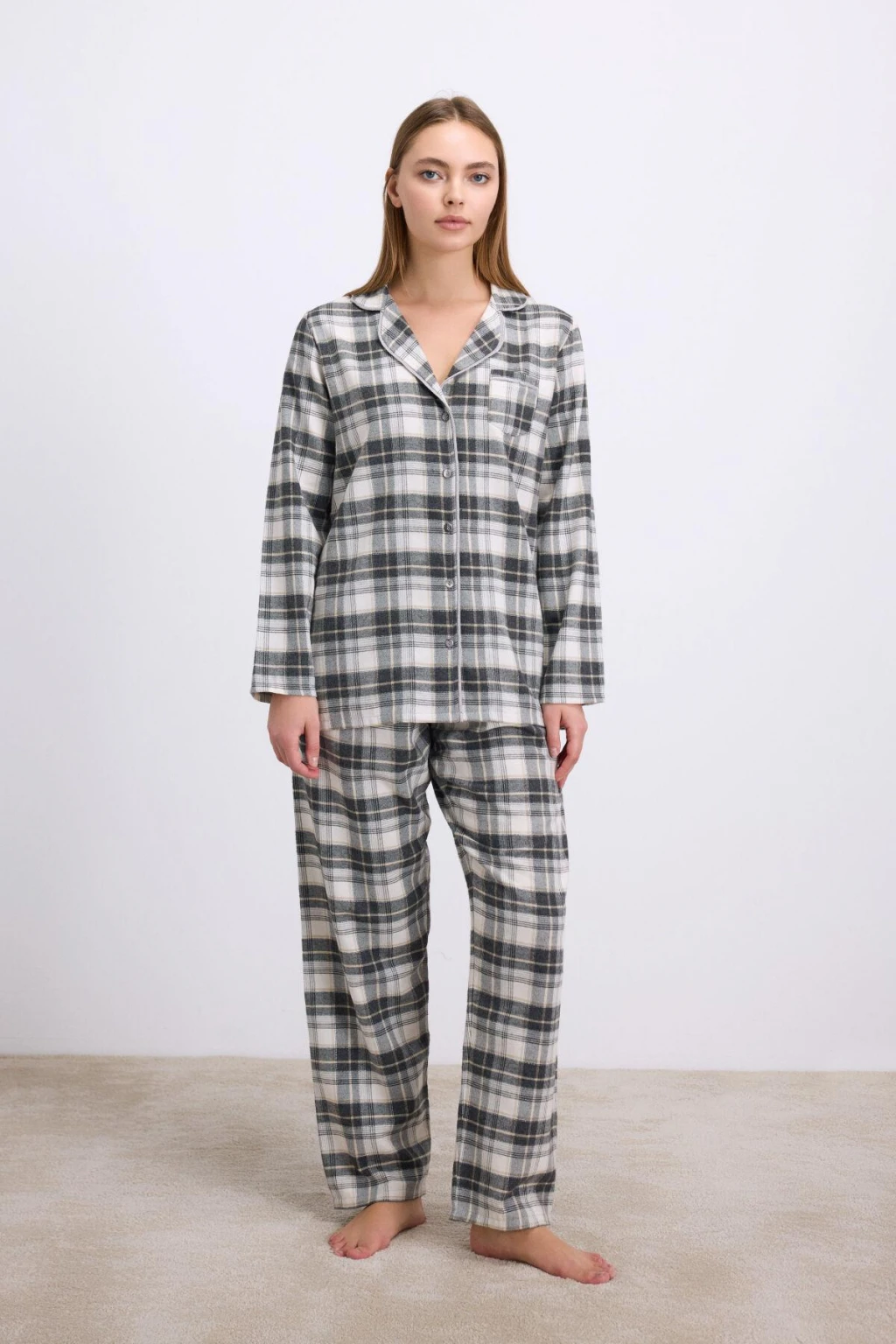%100 Pamuklu Uzun Kol Düğmeli Gömlek Ve Ekose Pantolon Pijama Takımı