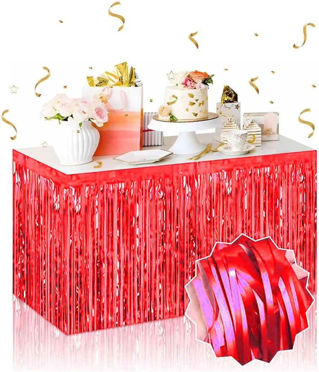 Kendinden Yapışkanlı Kırmızı Metalize Püsküllü Masa Eteği – 75 x 275 cm Parti Süslemesi
