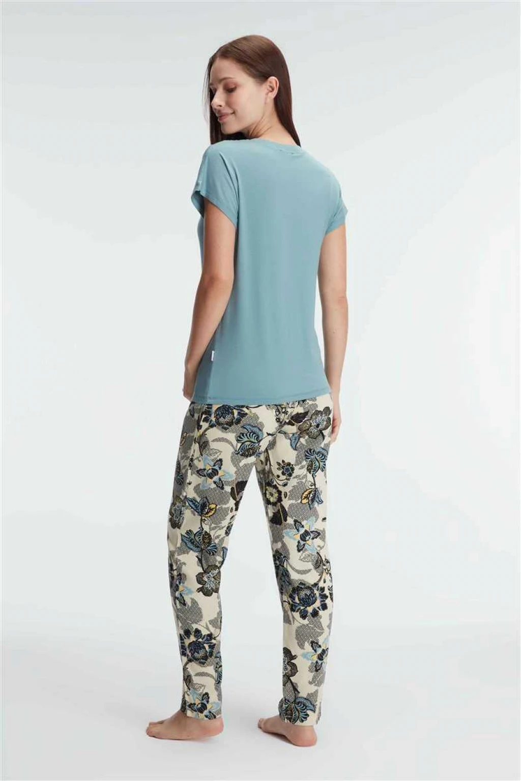 9866 Günlük Basic Ev Giyimi Kısa Kol Bisiklet Yaka Kadın Viskon Çiçek Desenli Yazlık Örme Normal Bel Uzun Diz_Altı Uzun Paçalı Transparan Tül Detaylı Pijama Takımı modelimiz