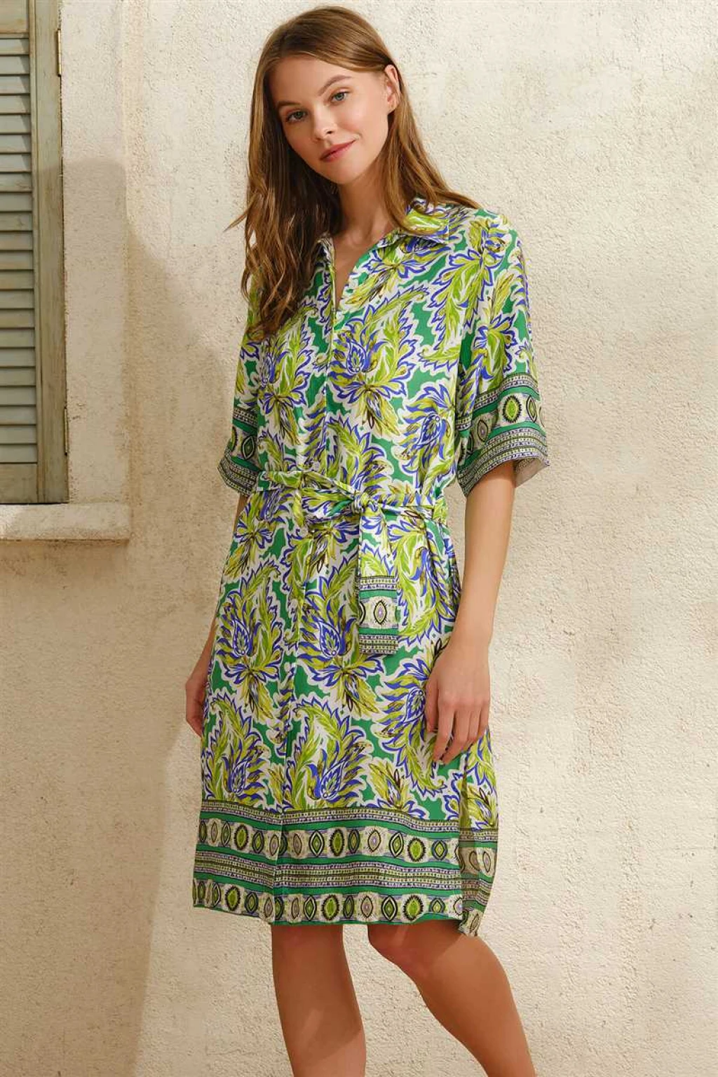 5758 Günlük Basic Ev Giyimi Kısa Yarım Kol V Yaka Kadın Viskon Çiçek Desenli Yazlık Dokuma Normal Bel Uzun Diz_Üstü Elbise