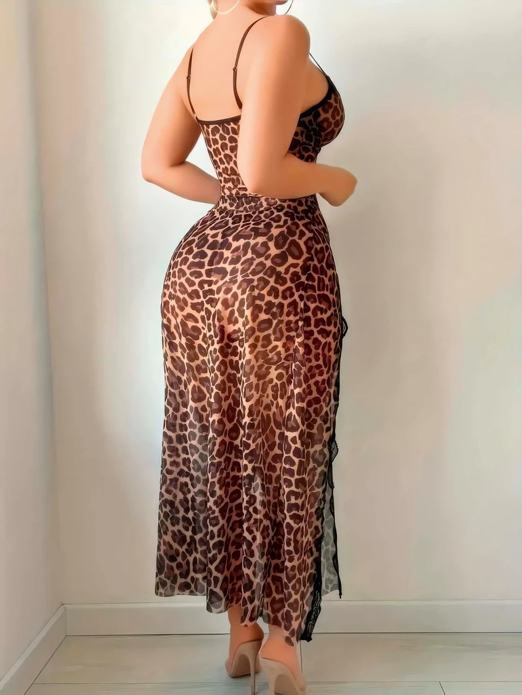 Leopar Desenli Yırtmaçlı Fantezi Uzun Gecelik