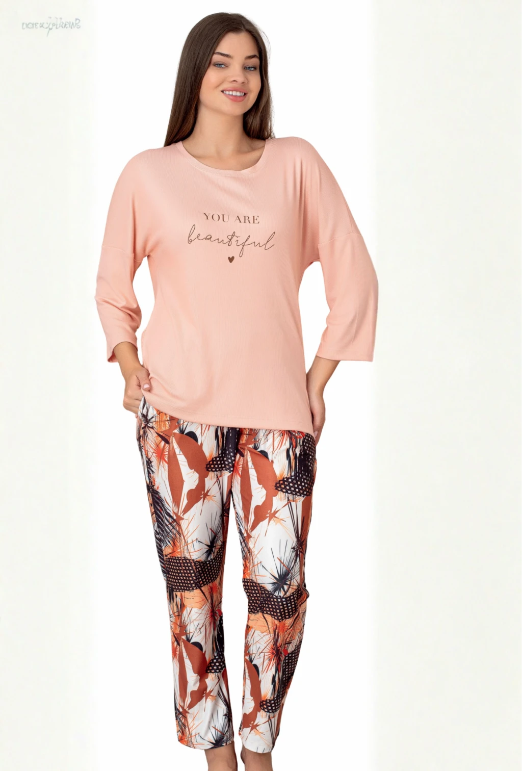 Somon rengiyle şıklığı ön plana çıkaran pijama takımı, soft dokusuyla da cildinize zarar vermez.