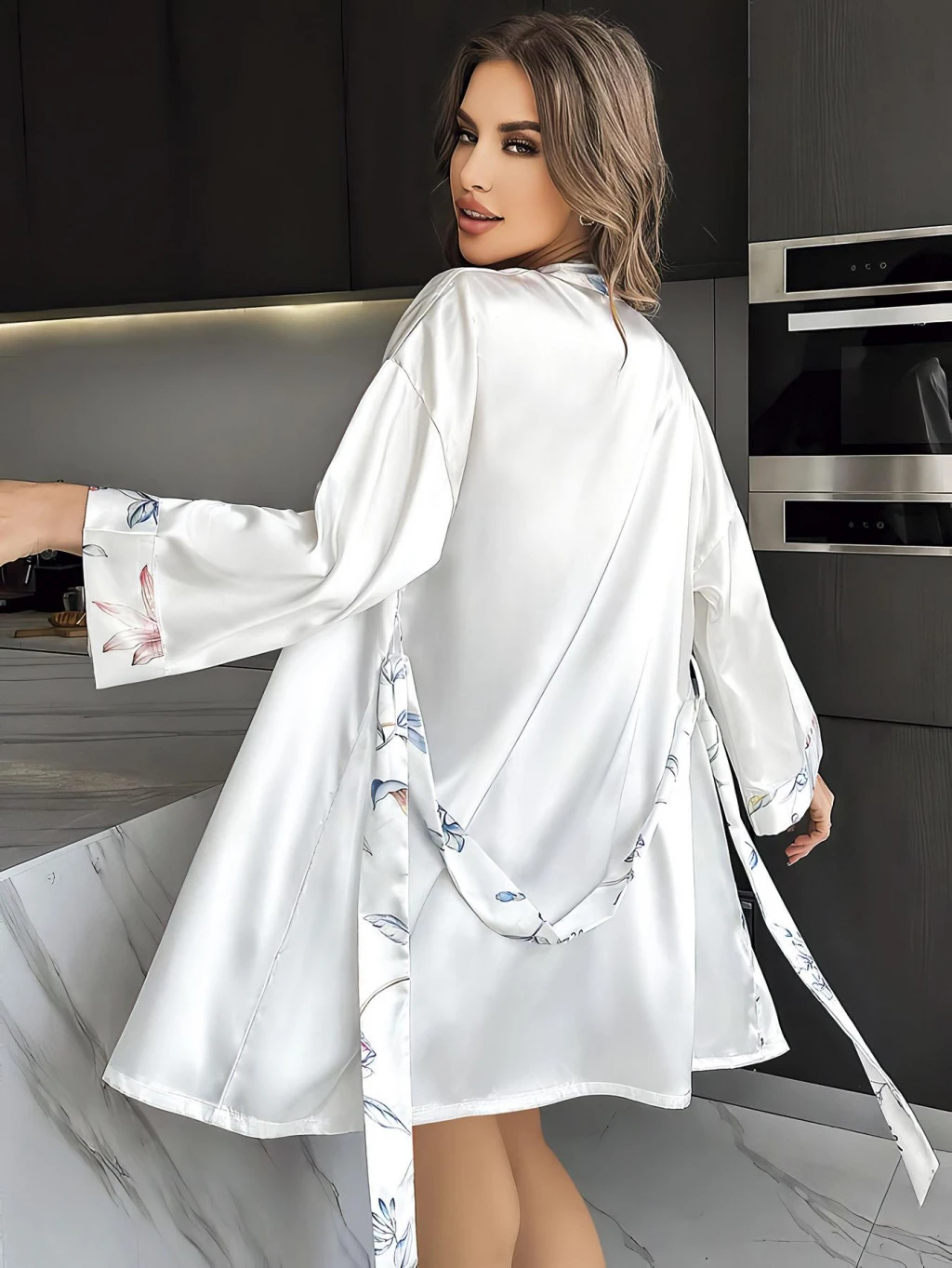 Özel Tasarım Çiçek Desenli Göğüs Dekolteli Sabahlıklı 2'li Beyaz Saten Gecelik Takımı