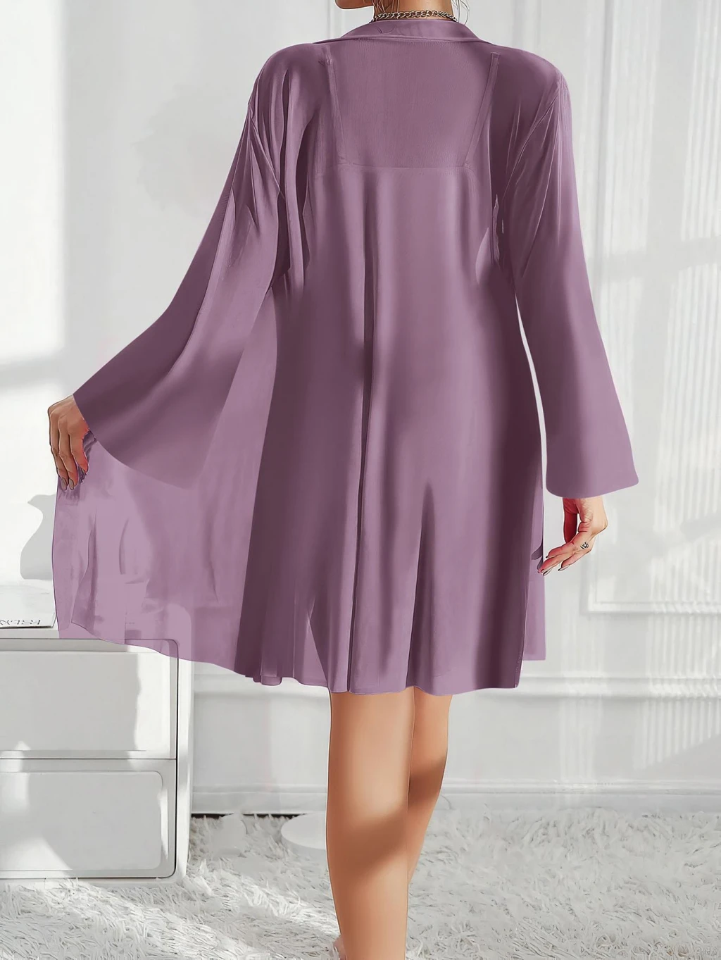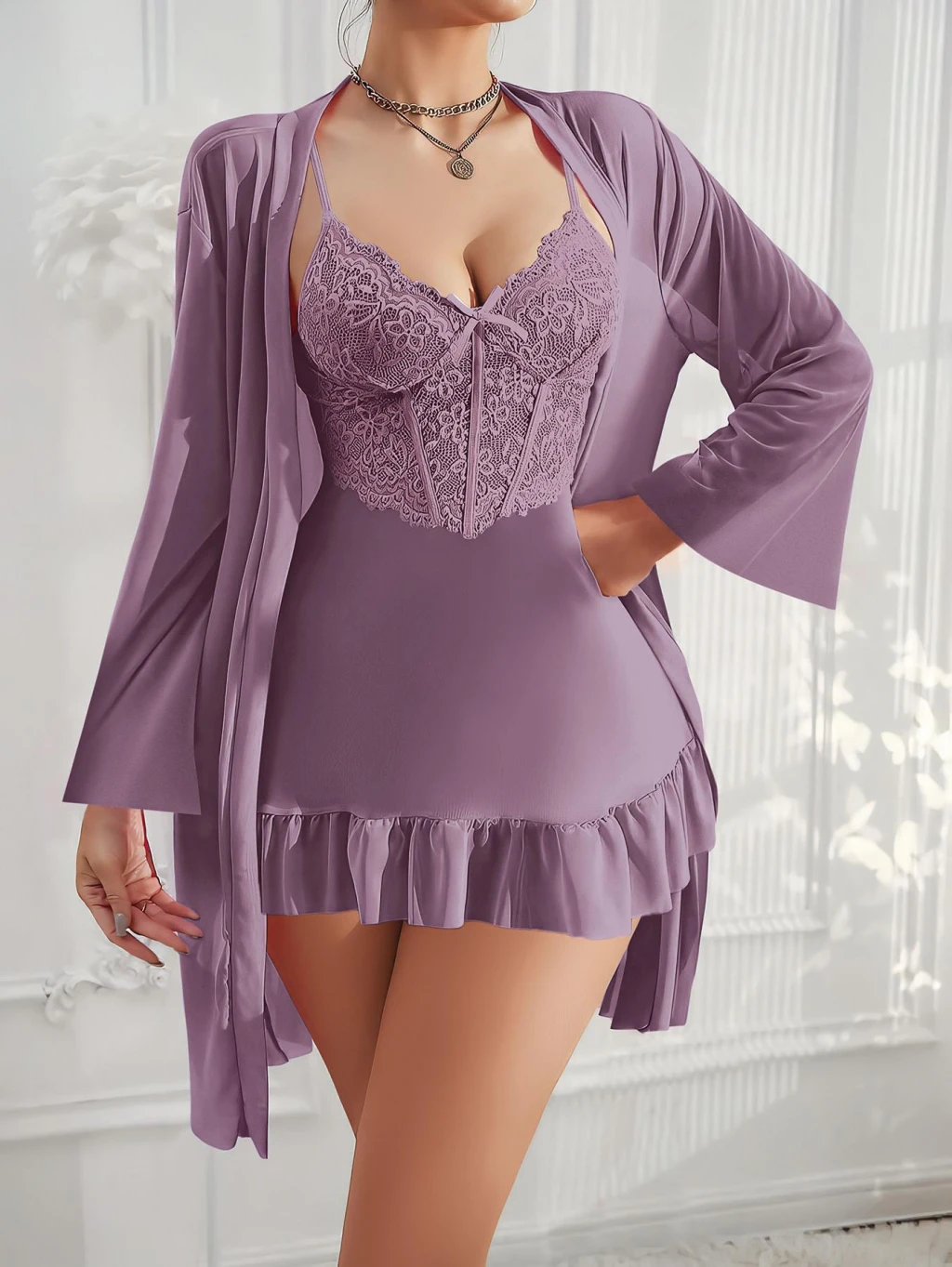 Özel Tasarım Dantel İşlemeli Fırfırlı Sabahlıklı 2'li Mor Gecelik Takımı