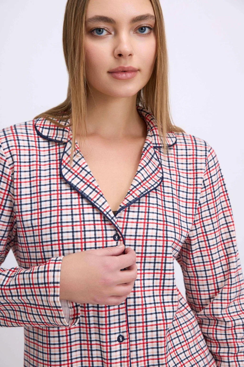Pamuklu Uzun Kol Düğmeli Gömlek Ve Ekose Pantolon Pijama Takımı