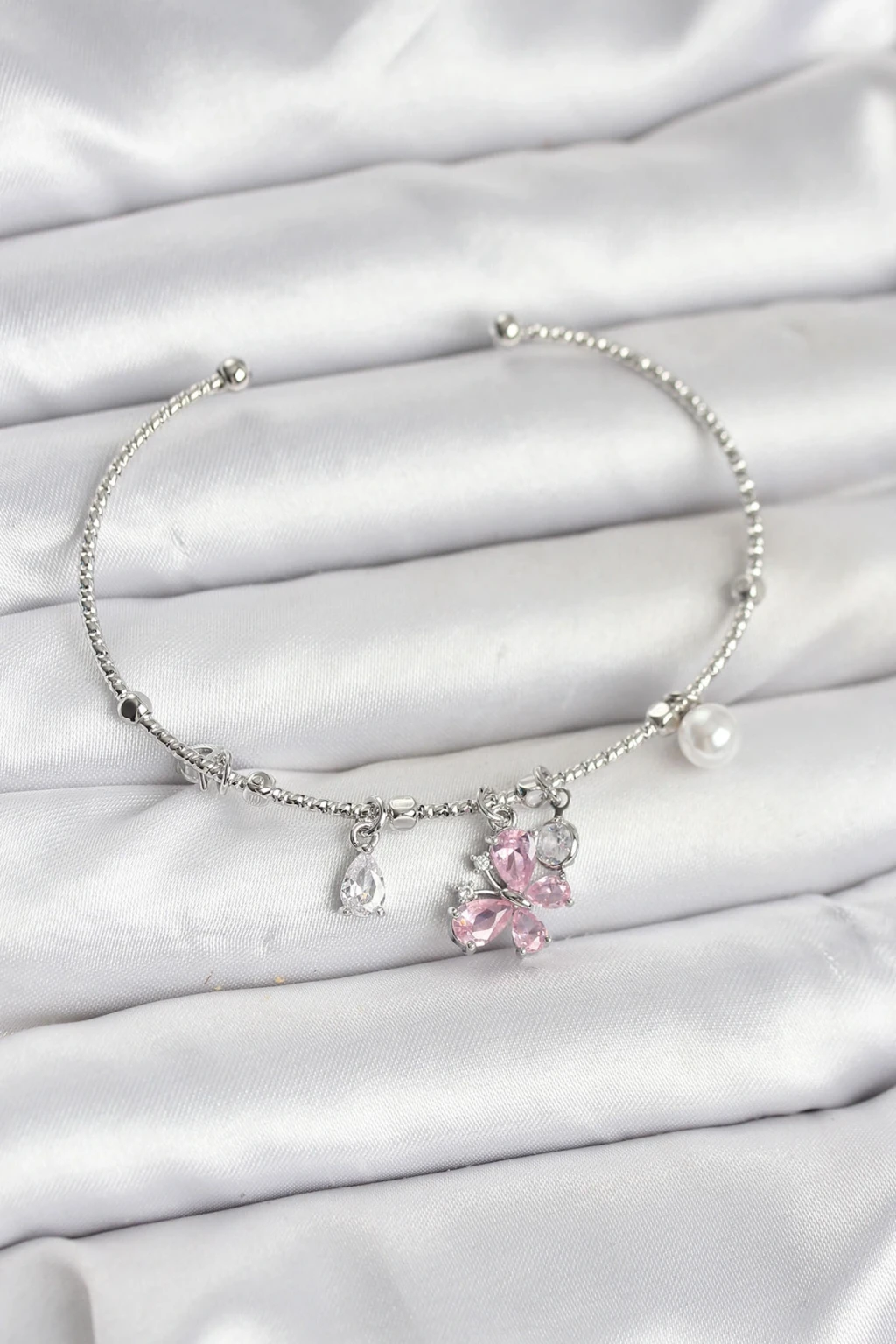 Pembe Kelebek Charmlı Gümüş Renk Kadın Bileklik - TJ-BB8032