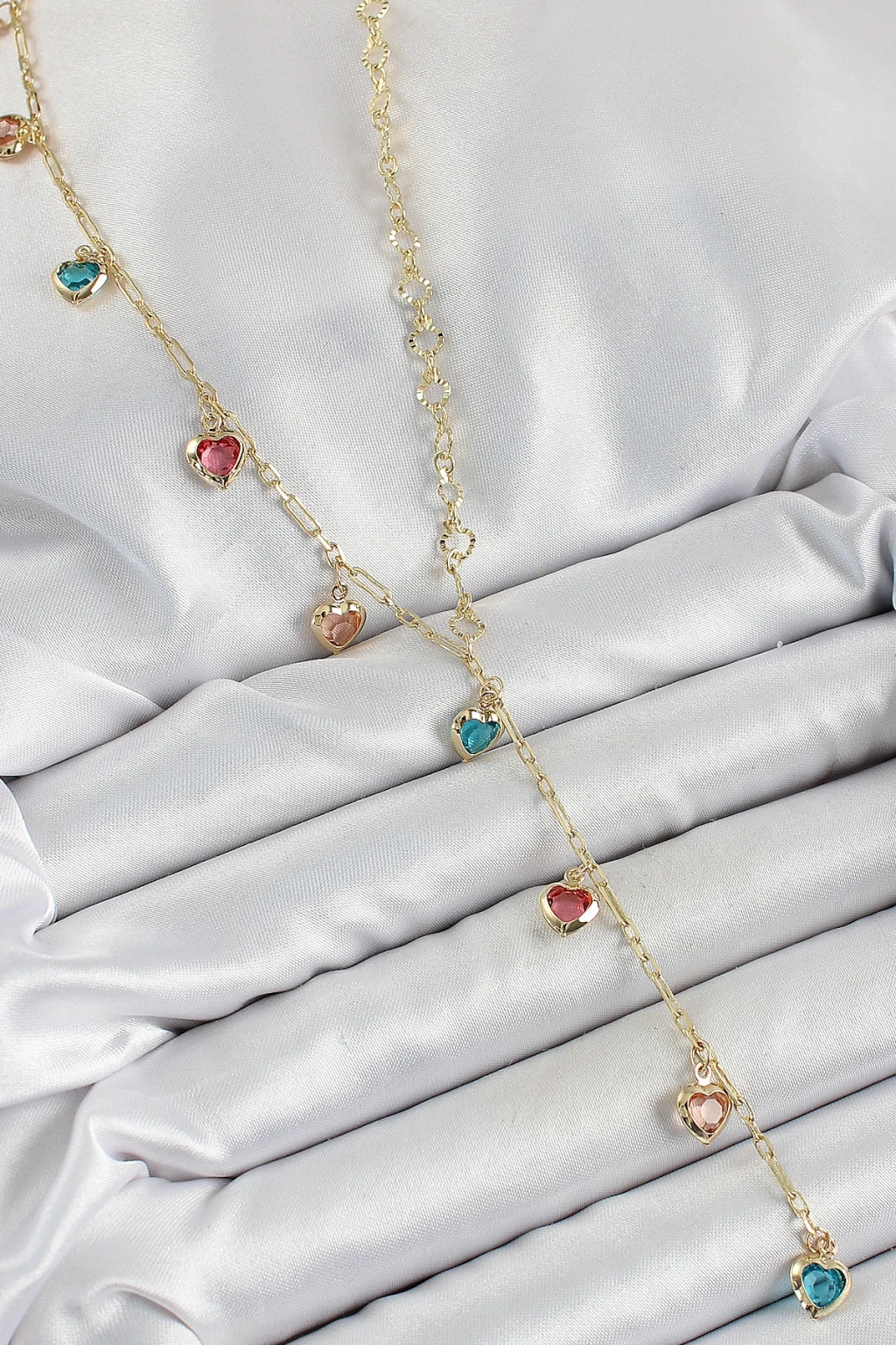 Pirinç Asorti Kalp Model Gold Renk Zirkon Taşlı Y Kolye - TJ-BKO10248