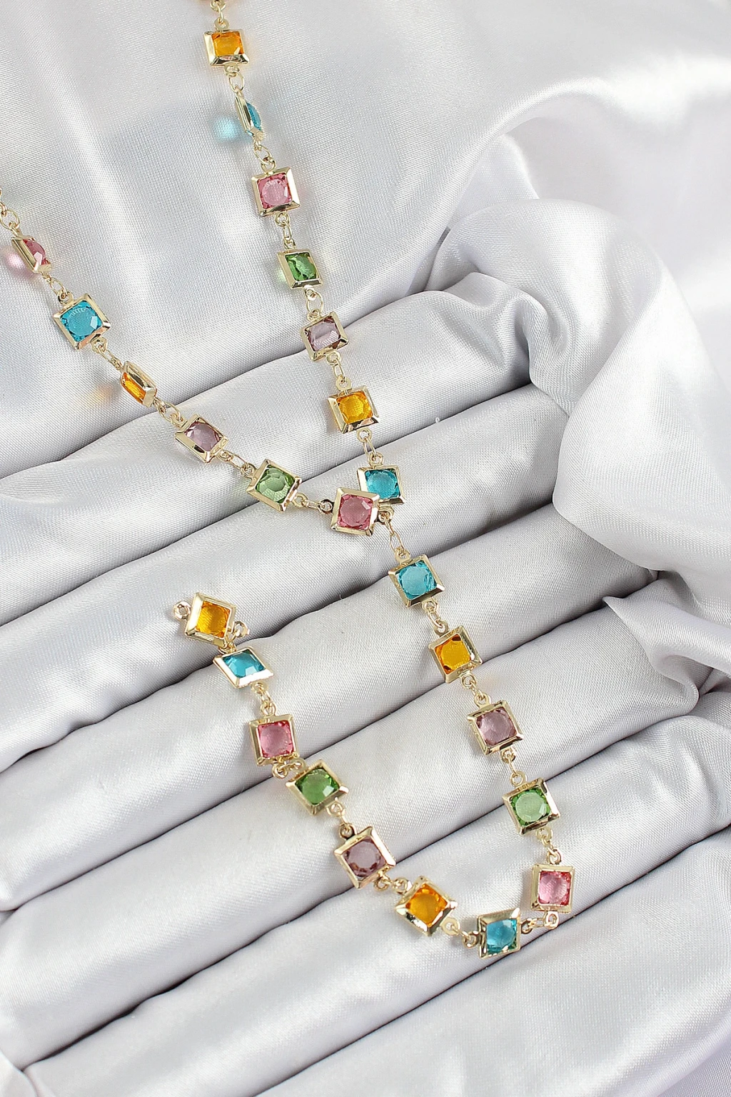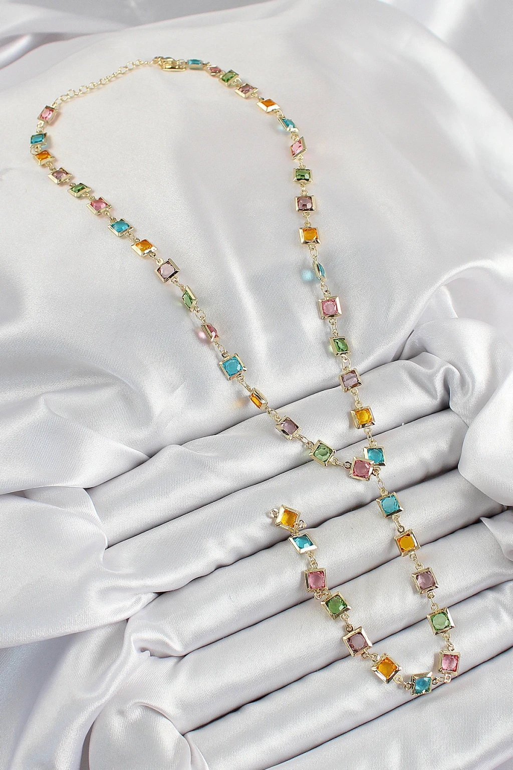 Pirinç Asorti Kare Model Gold Renk Zirkon Taşlı Y Kolye - TJ-BKO10253