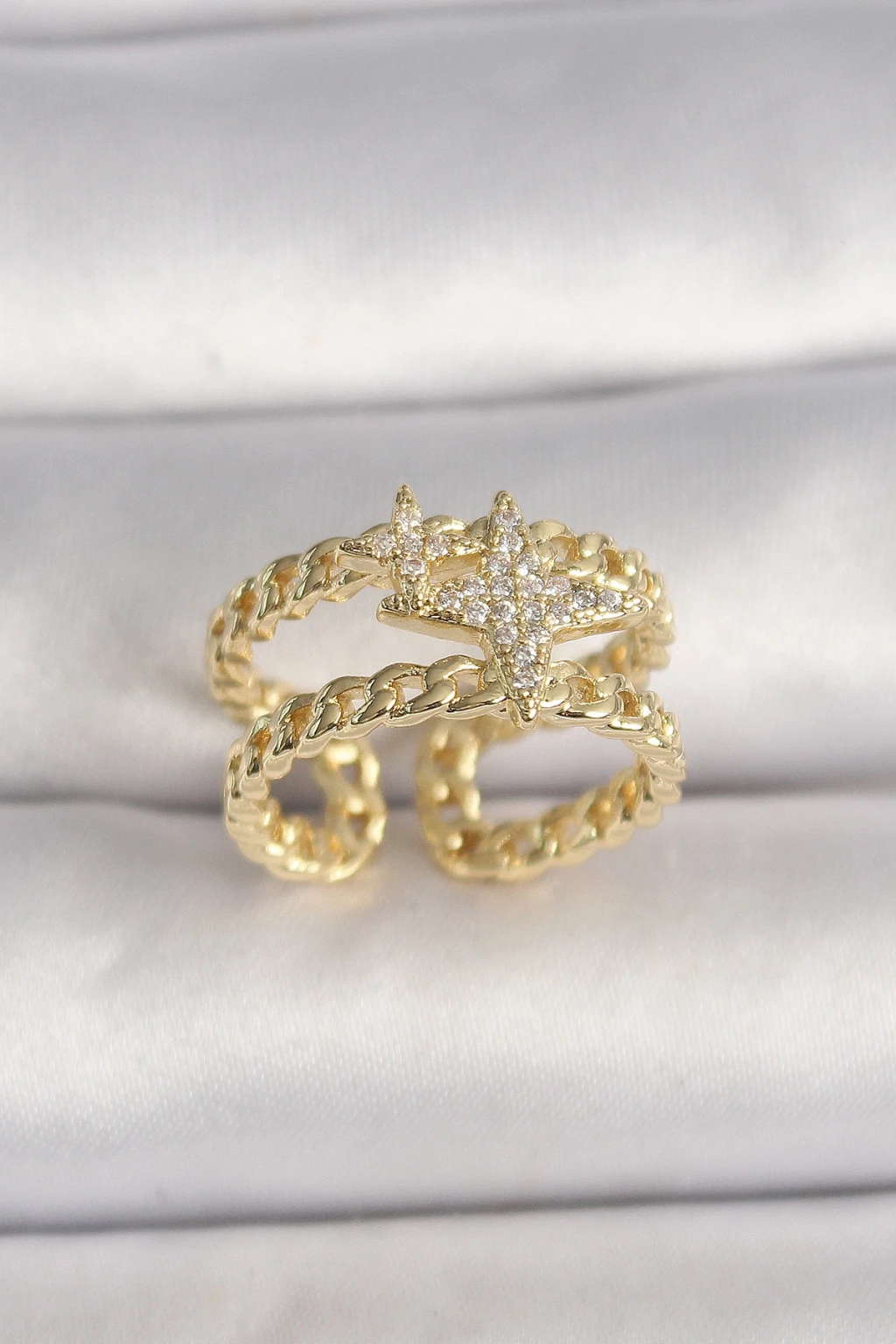 Pirinç Ayarlamalı Gold Renk Zirkon Taşlı 2li Görünüm Fiyonk Yüzük - TJ-BYK3287