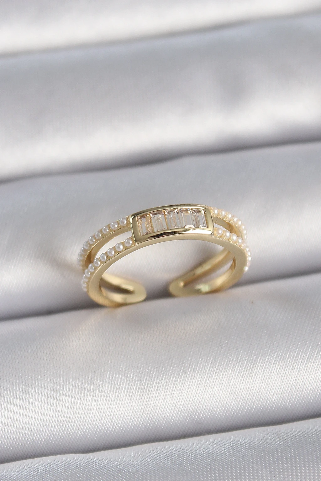 Pirinç Gold Renk Ayarlanabilir Sıralı İncili Zirkon Taş Detaylı Kadın Yüzük - TJ-BYK3380