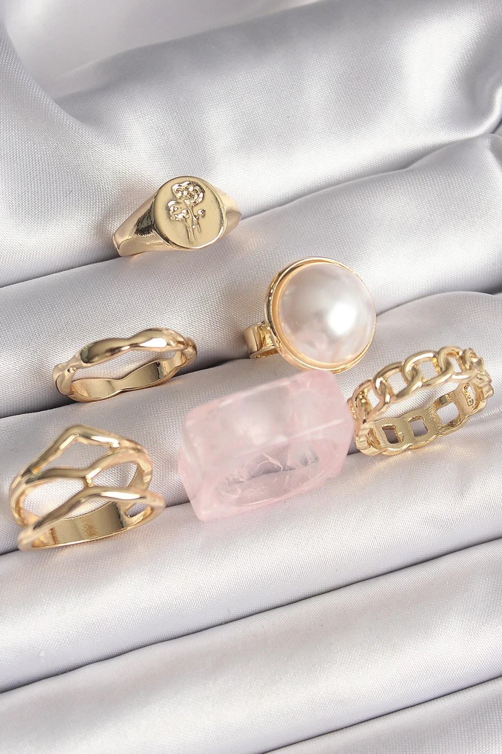 Pirinç Gold Renk Daire 3D İncili Figür Zincir Model Gül İşleme Detaylı 6'Lı Kadın Yüzük Seti - TJ-BYK3625