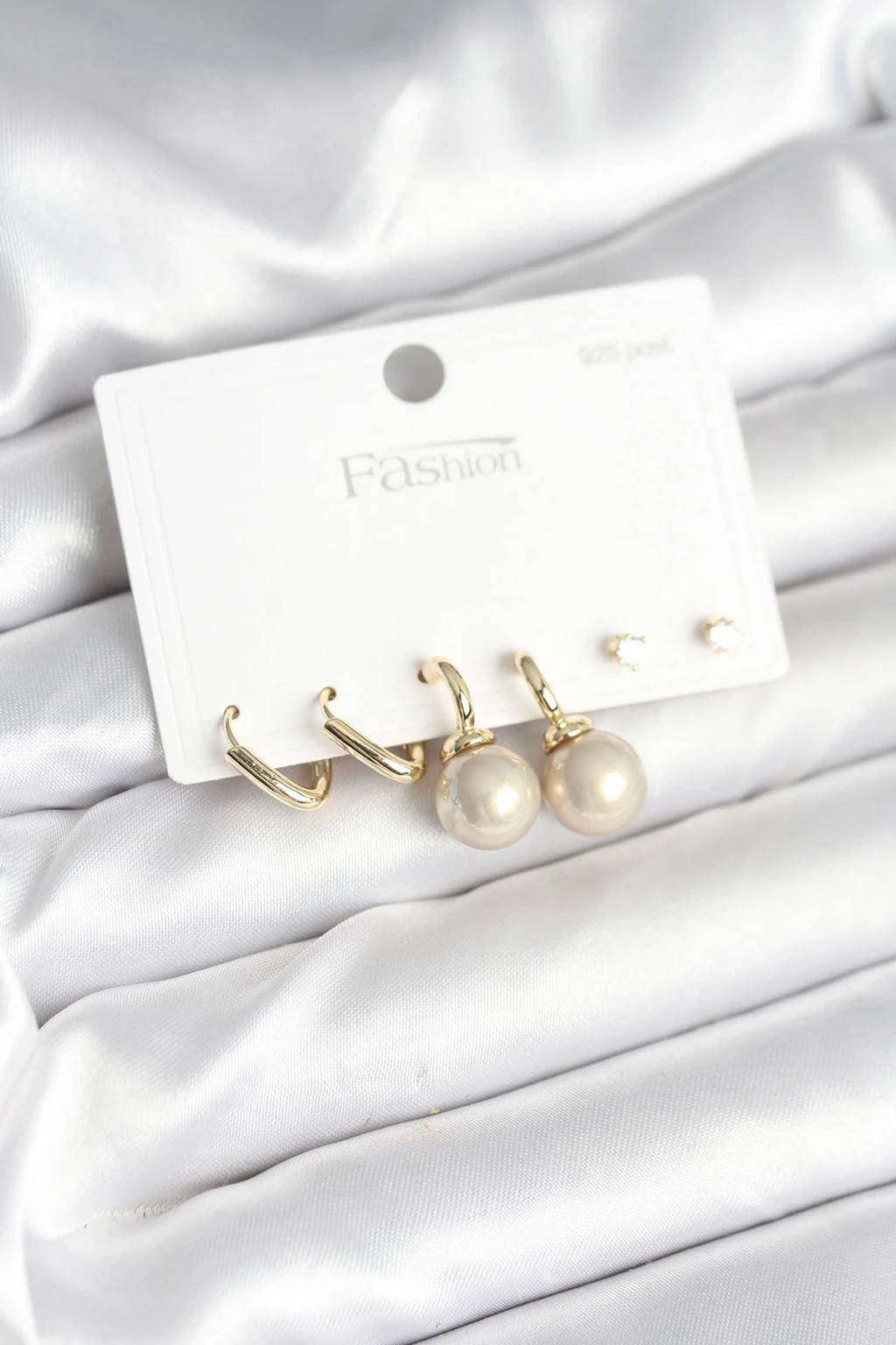 Pirinç Gold Renk İnci Detaylı 925 Gümüş Çivili Kadın Küpe Seti - TJ-BKP11253