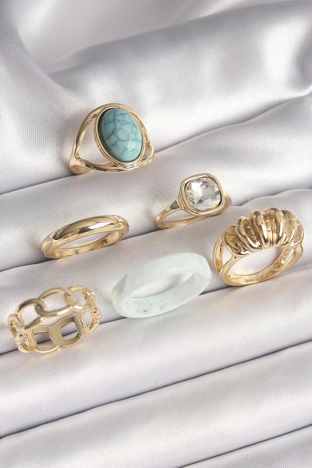 Pirinç Gold Renk Kare Zirkon Taşlı Sarmal Model Mavi Taş Detay 6'Lı Kadın Yüzük Seti - TJ-BYK3624