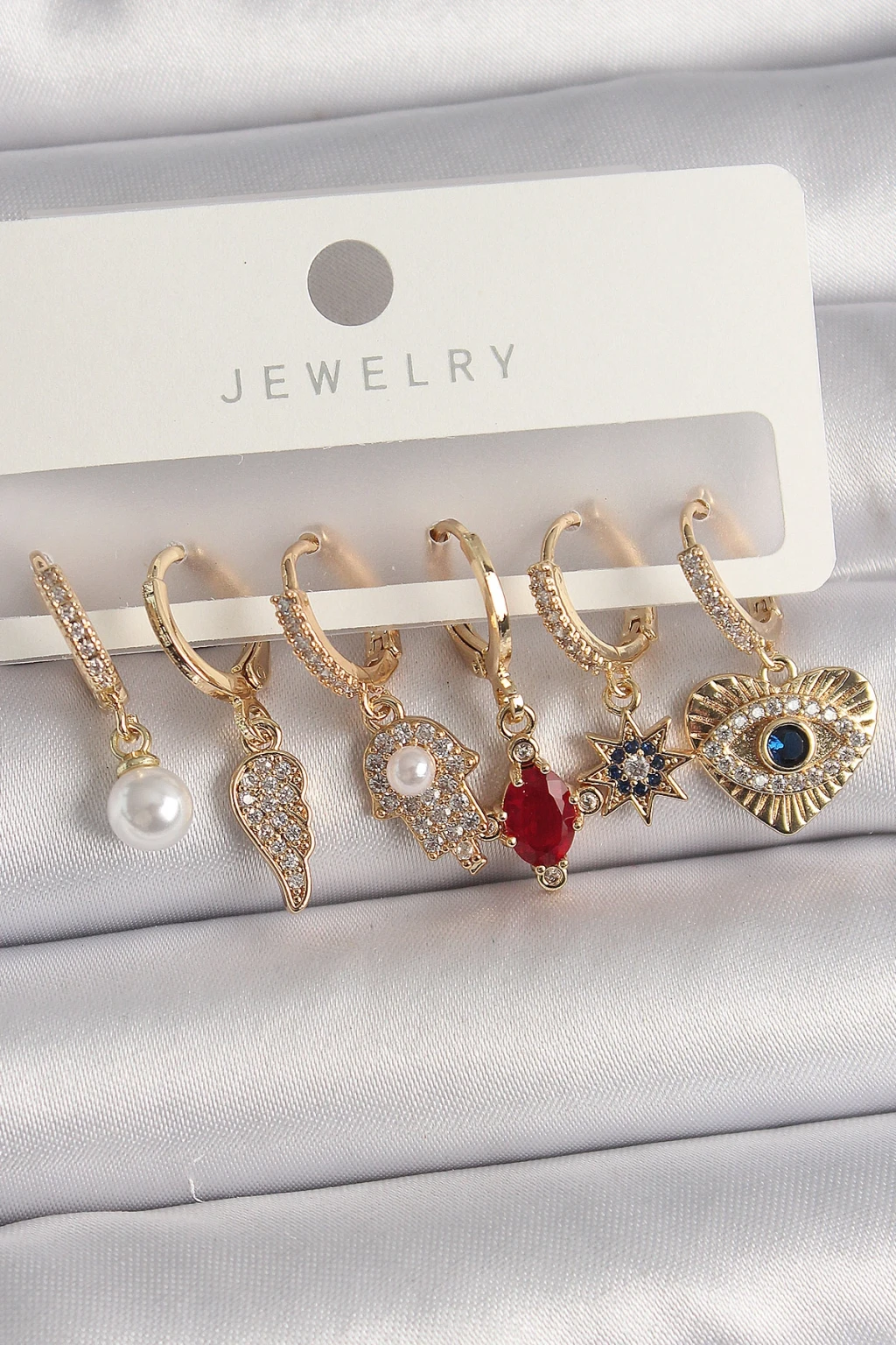 Pirinç Gold Renk Sallantı Zirkon Taşlı Fatma Ana El Figür Kadın Küpe Seti - TJ-BKP10116