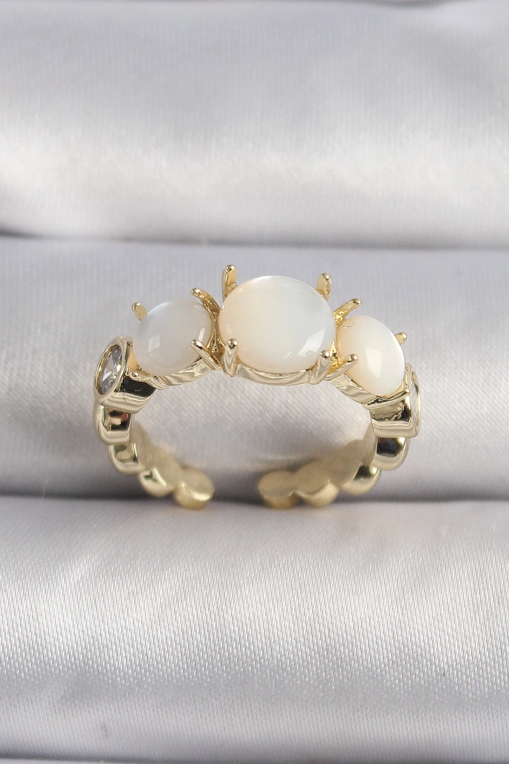 Pirinç Gold Renk Zirkon Taş Detaylı Beyaz Sedefli VIP Seri Kadın Yüzük - TJ-BYK3504
