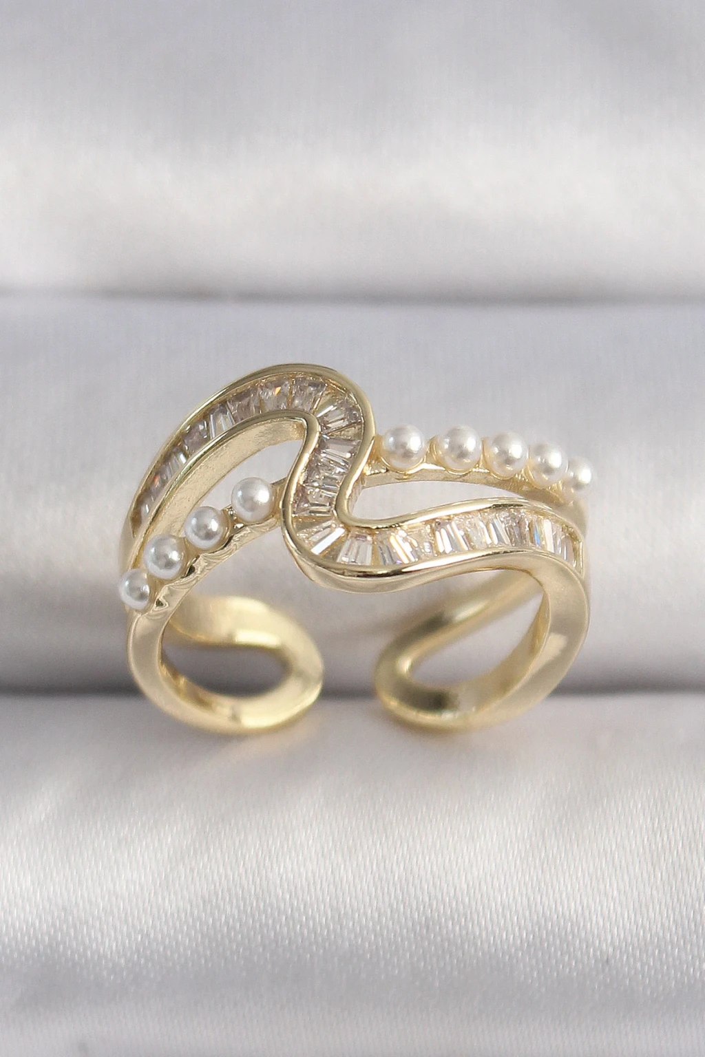 Pirinç Gold Renk Zirkon Taşlı İnci Detay VIP Seri Kadın Yüzük - TJ-BYK3512