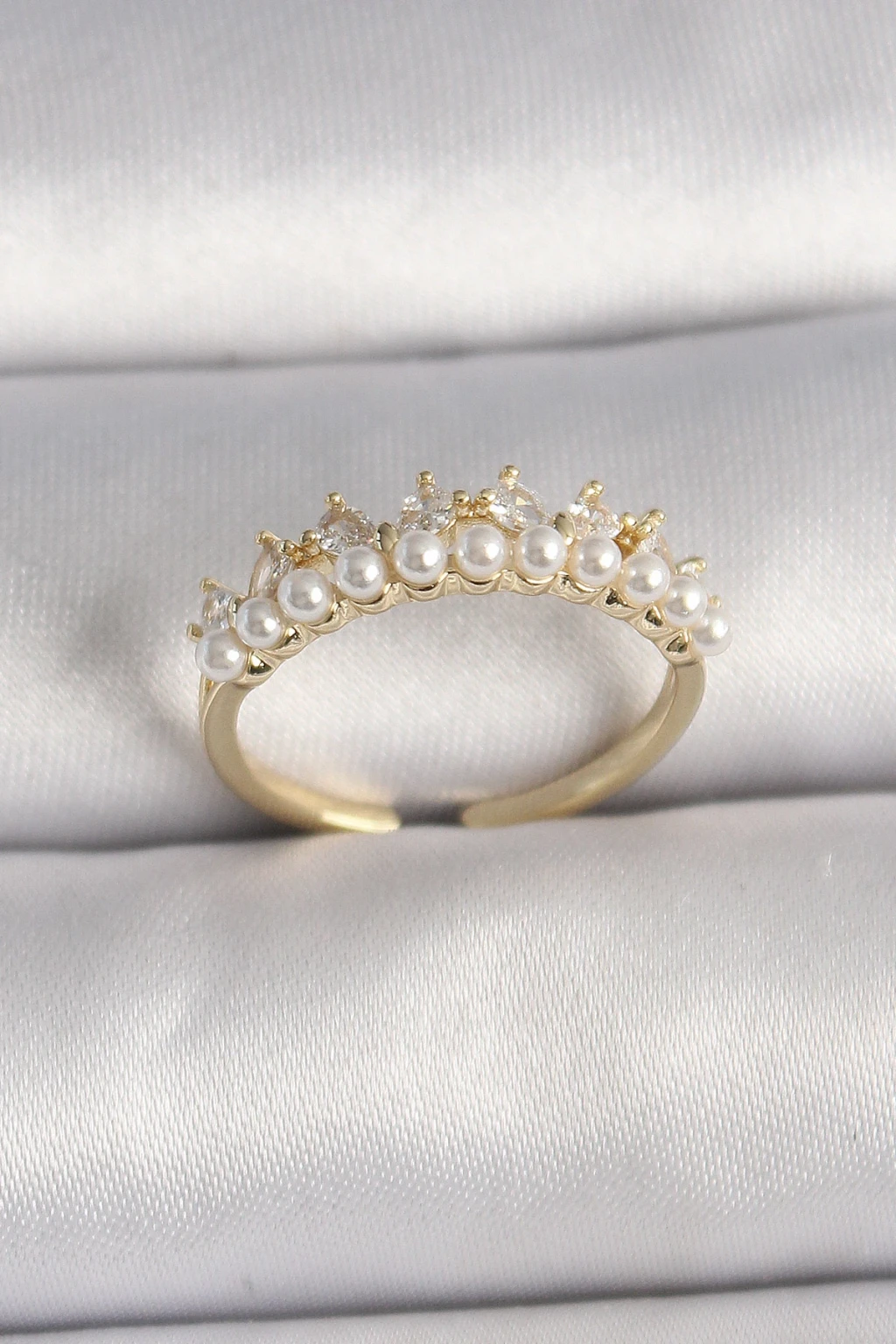 Pirinç Gold Renk Zirkon Taşlı İncili Taç Model Ayarlanabilir Kadın Yüzük - TJ-BYK3576