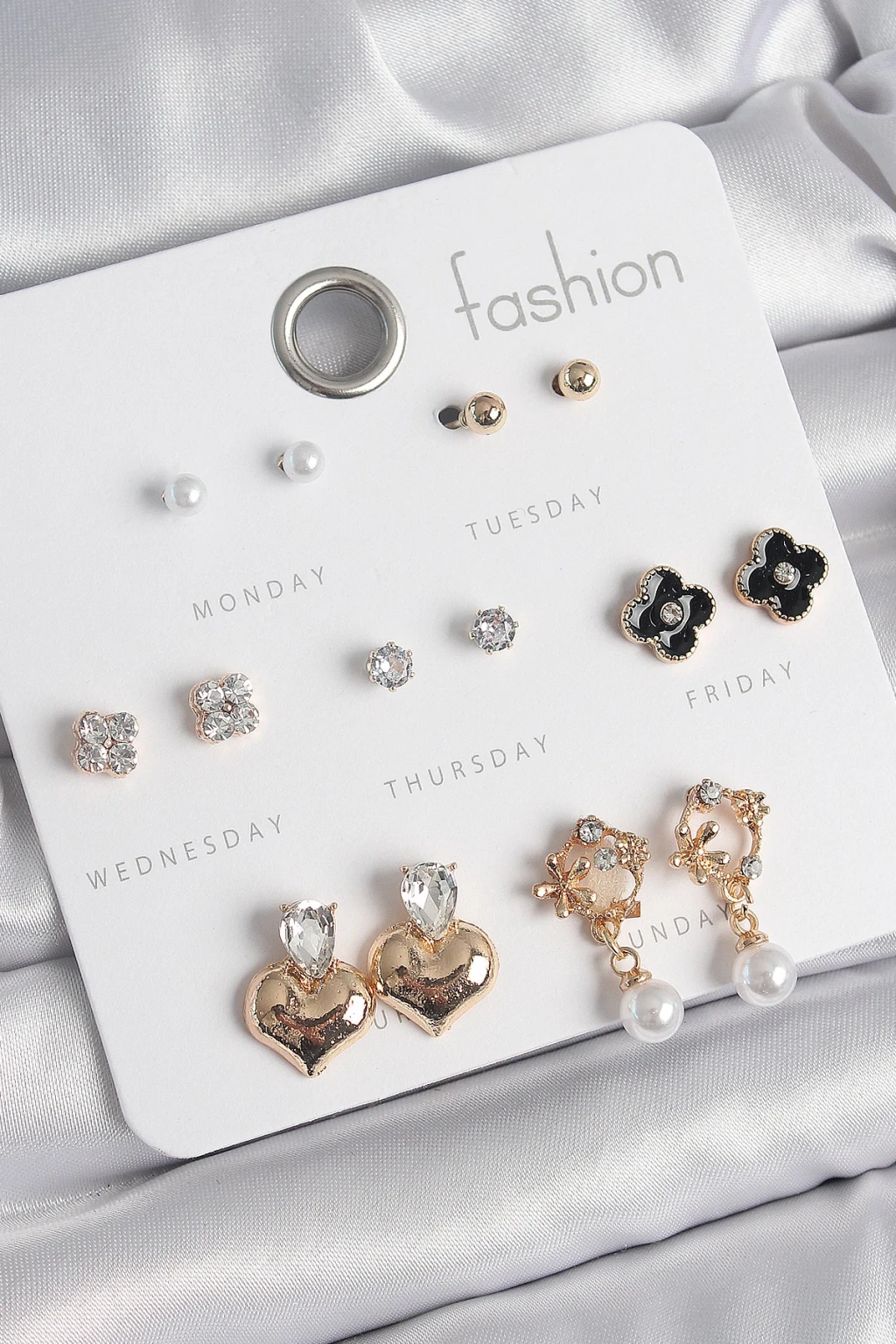 Pirinç Gold Renk Zirkon Taşlı Kalp Figür Siyah Yonca Detay 7 Çift Kadın Küpe Seti - TJ-BKP10541