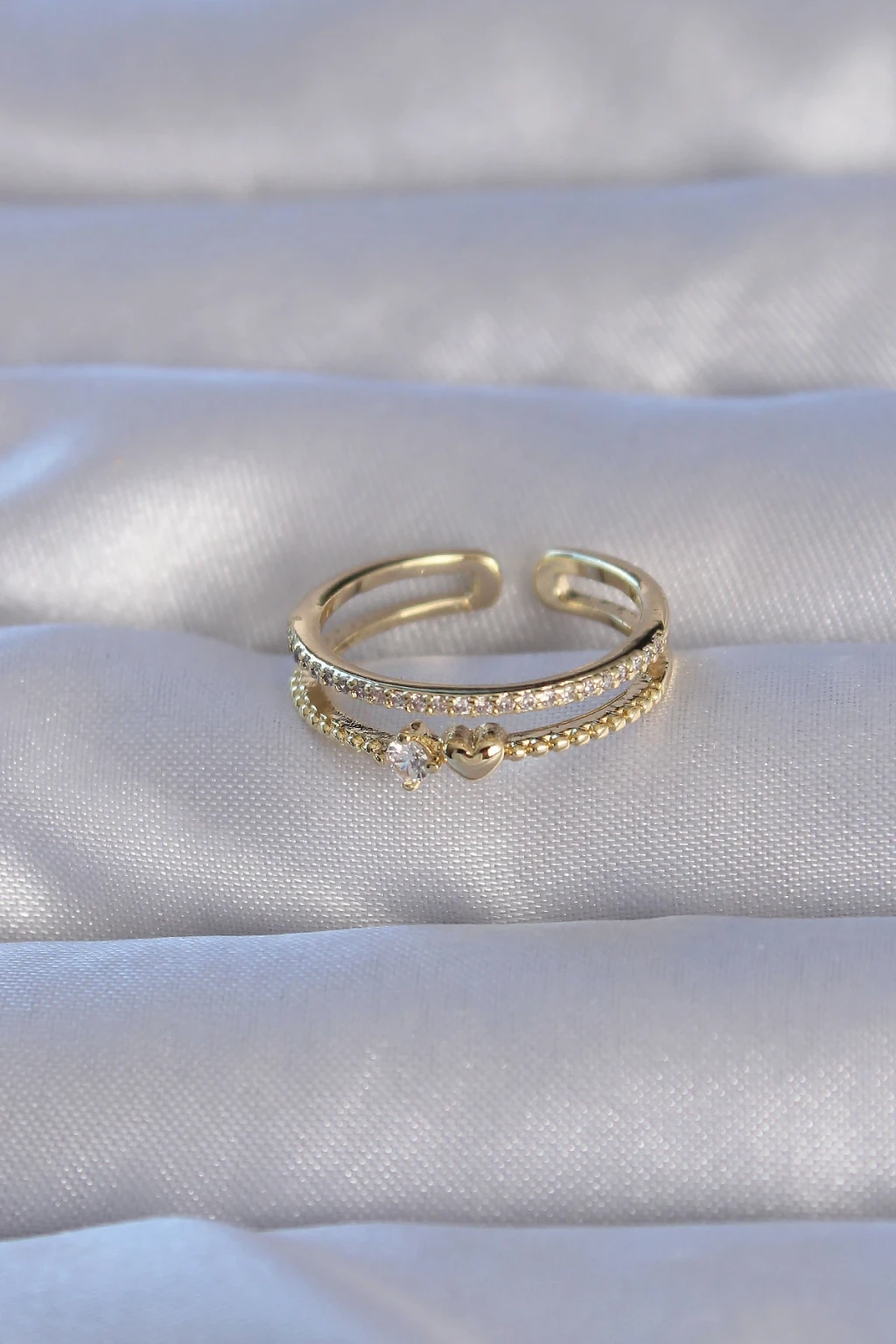 Pirinç Gold Renk Zirkon Taşlı Kalpli Su Yolu Model Ayarlanabilir Yüzük - TJ-BYK3221