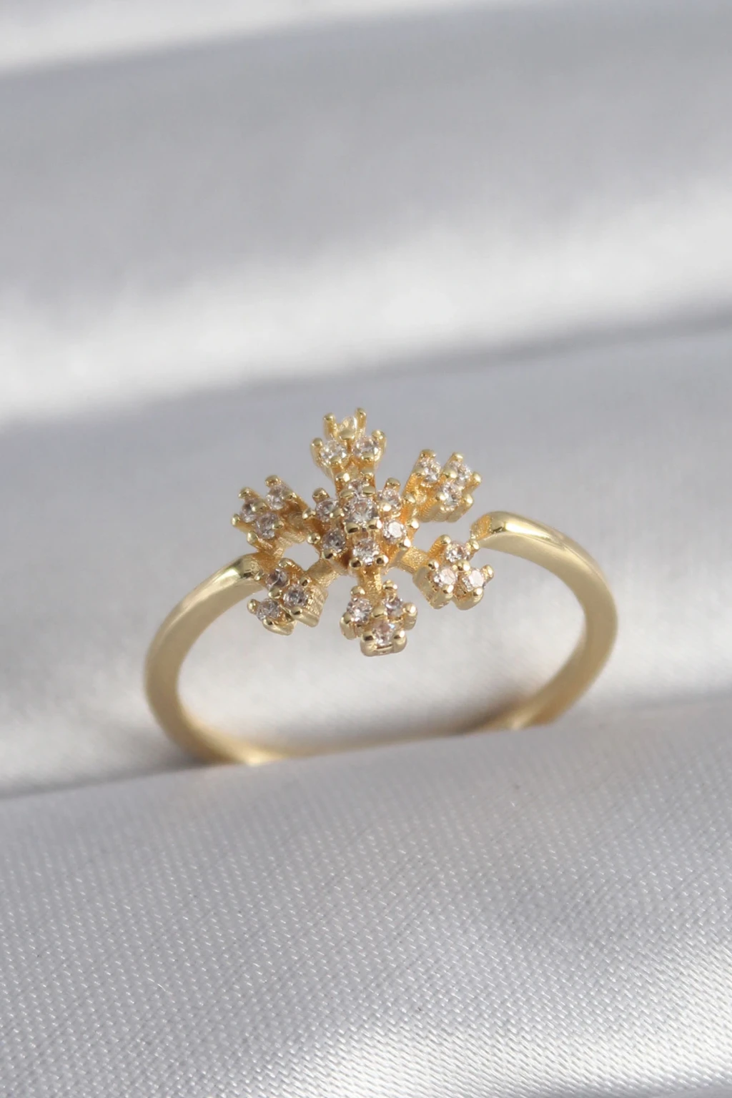 Pirinç Gold Renk Zirkon Taşlı Kar Tanesi Model Kadın Yüzük - TJ-BYK3033