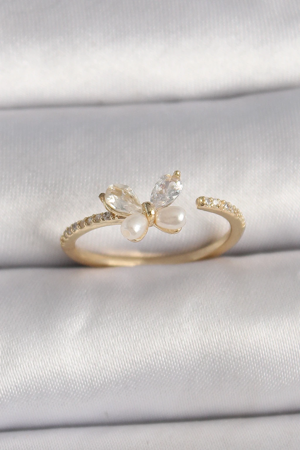 Pirinç Gold Renk Zirkon Taşlı Kelebek Mode İnci Detay Ayarlanabilir Yüzük - TJ-BYK3557