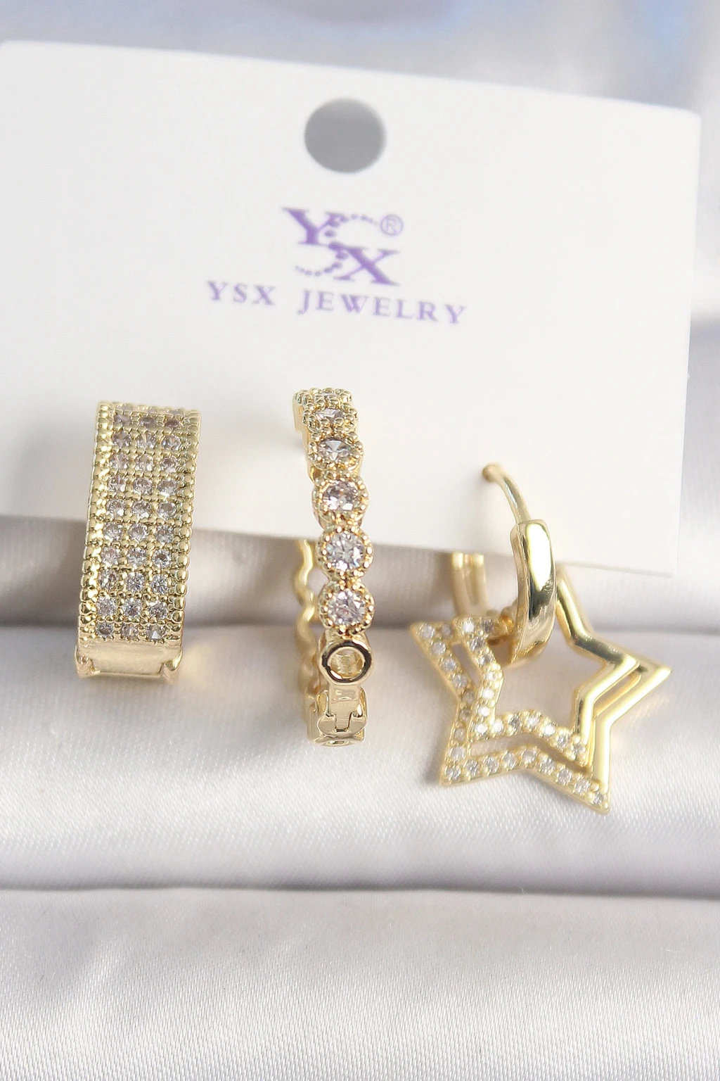 Pirinç Gold Renk Zirkon Taşlı Yıldız Figür Halka Model 3'Lü Kadın Kombin Küpe - TJ-BKP10437