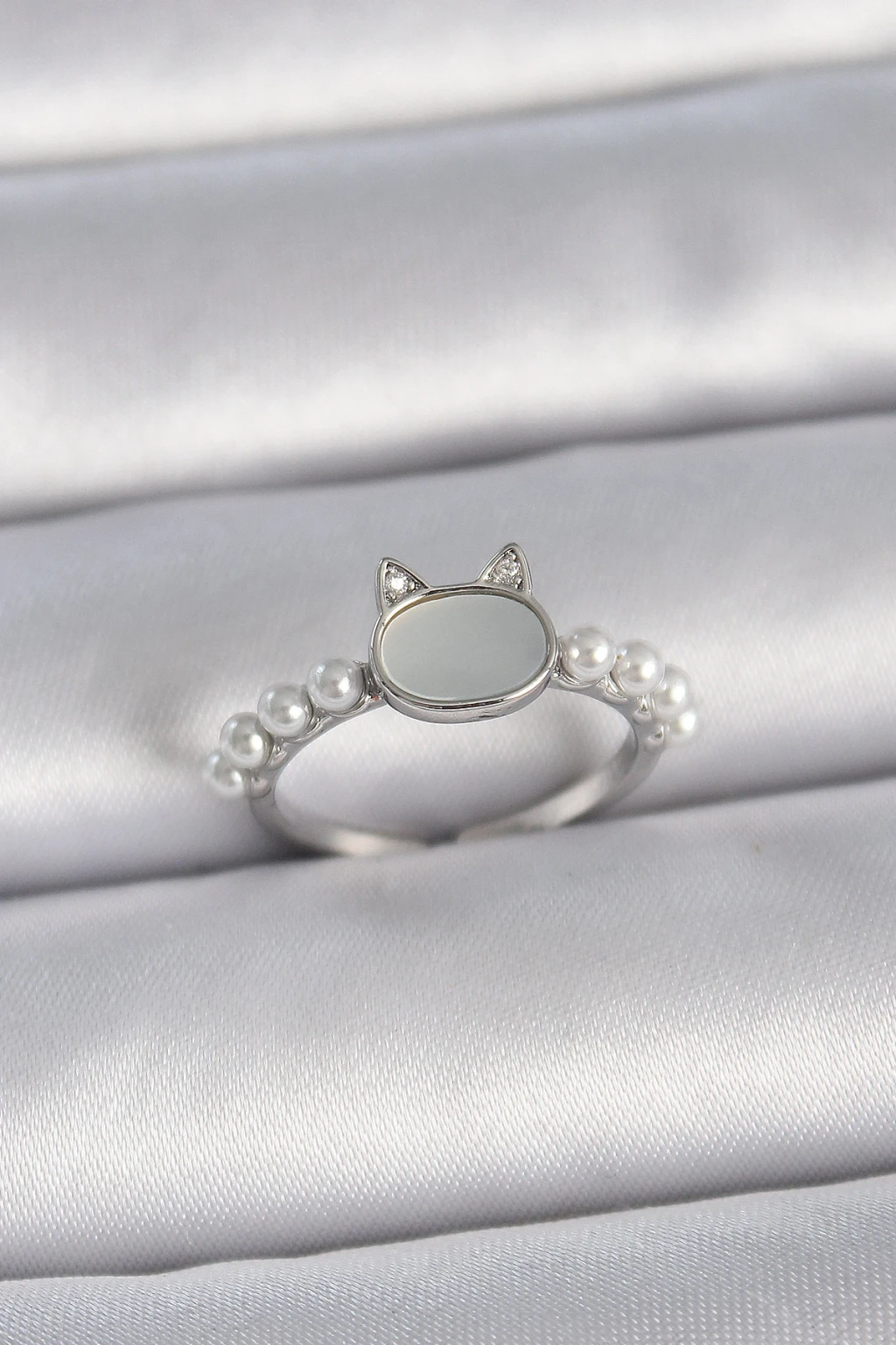 Pirinç Gümüş Renk Ayarlanabilir Beyaz Mineli Kedi Model İnci Detay Kadın Yüzük - TJ-BYK3387