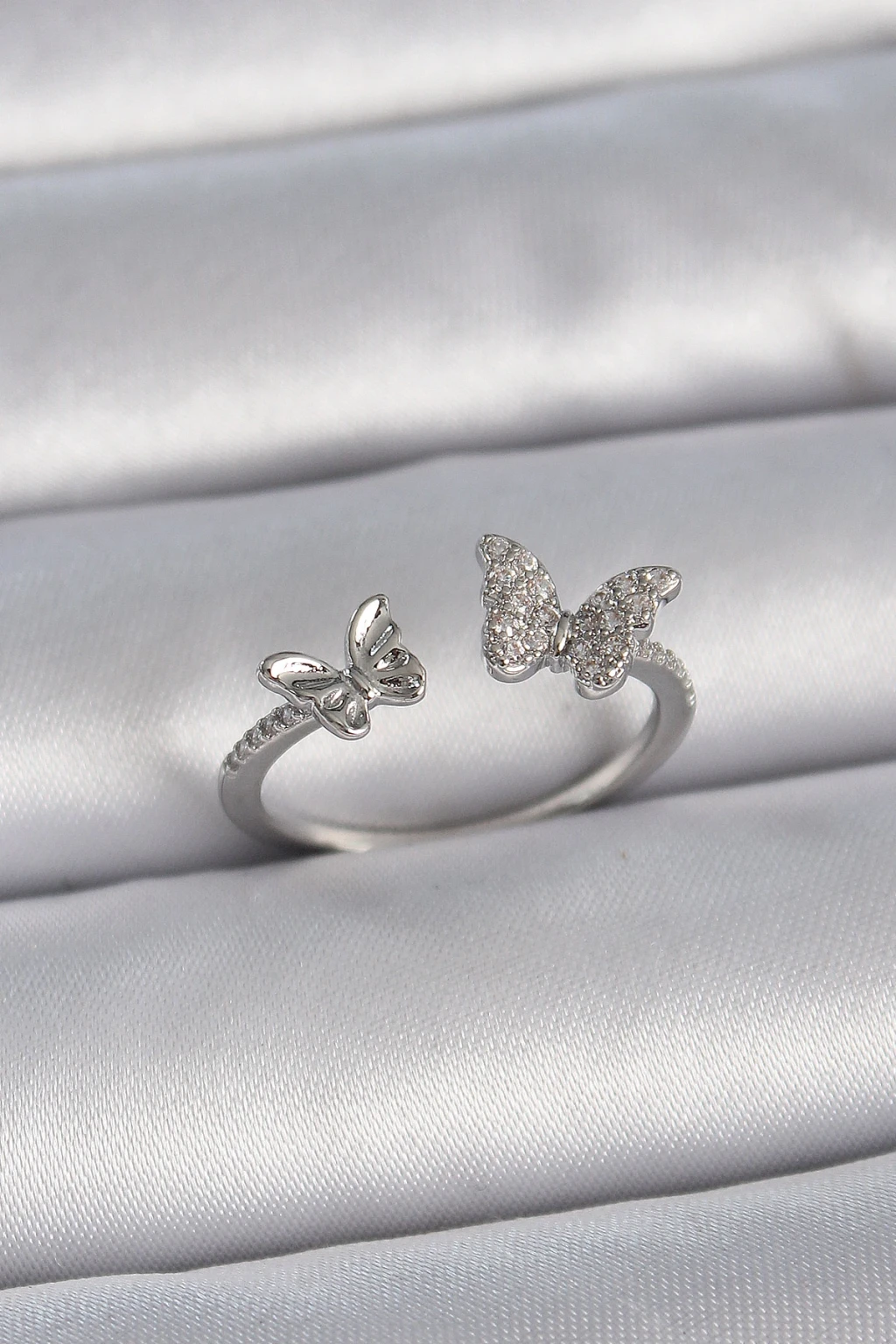Pirinç Gümüş Renk Ayarlanabilir Zirkon Taşlı Kelebek Model Kadın Yüzük - TJ-BYK3375