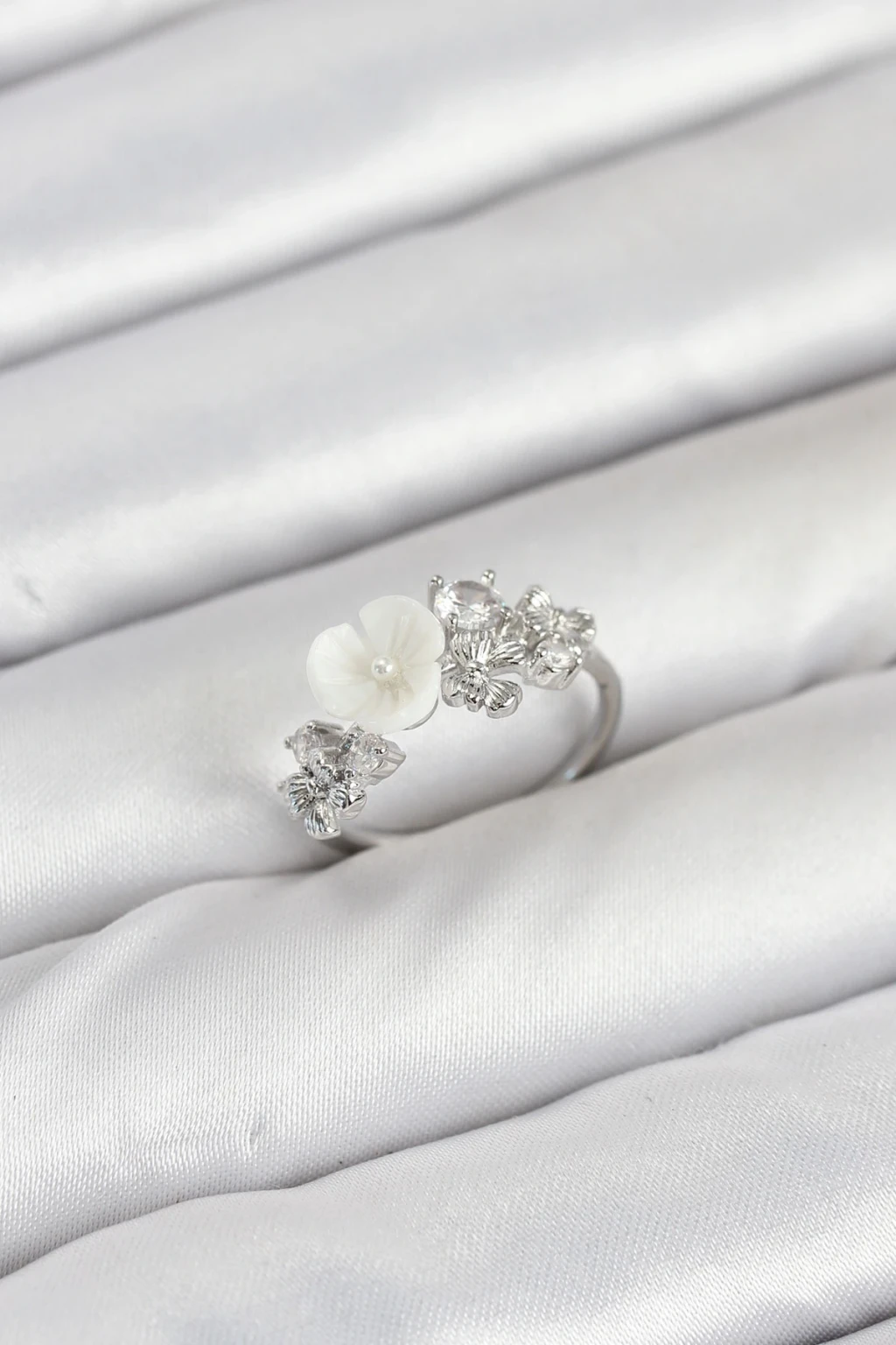 Pirinç Gümüş Renk Çiçek Model Zirkon Taşlı Kadın Yüzük - TJ-BYK3879