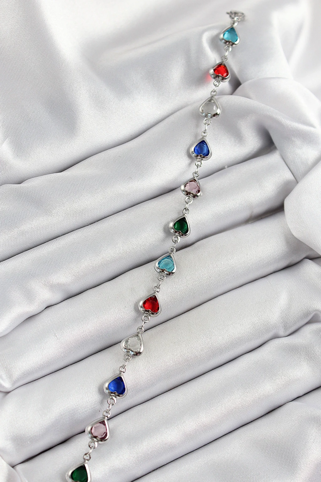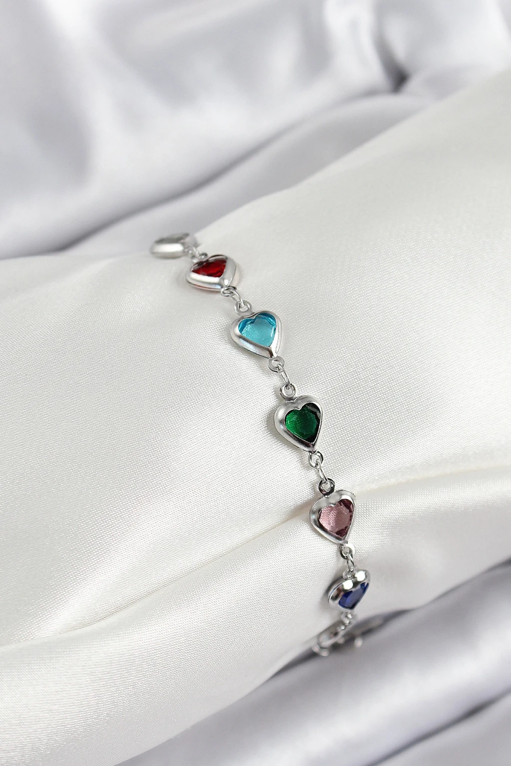 Pirinç Gümüş Renk Karışık Renk Kalp Zirkon Taşlı Kadın Bileklik - TJ-BB7052