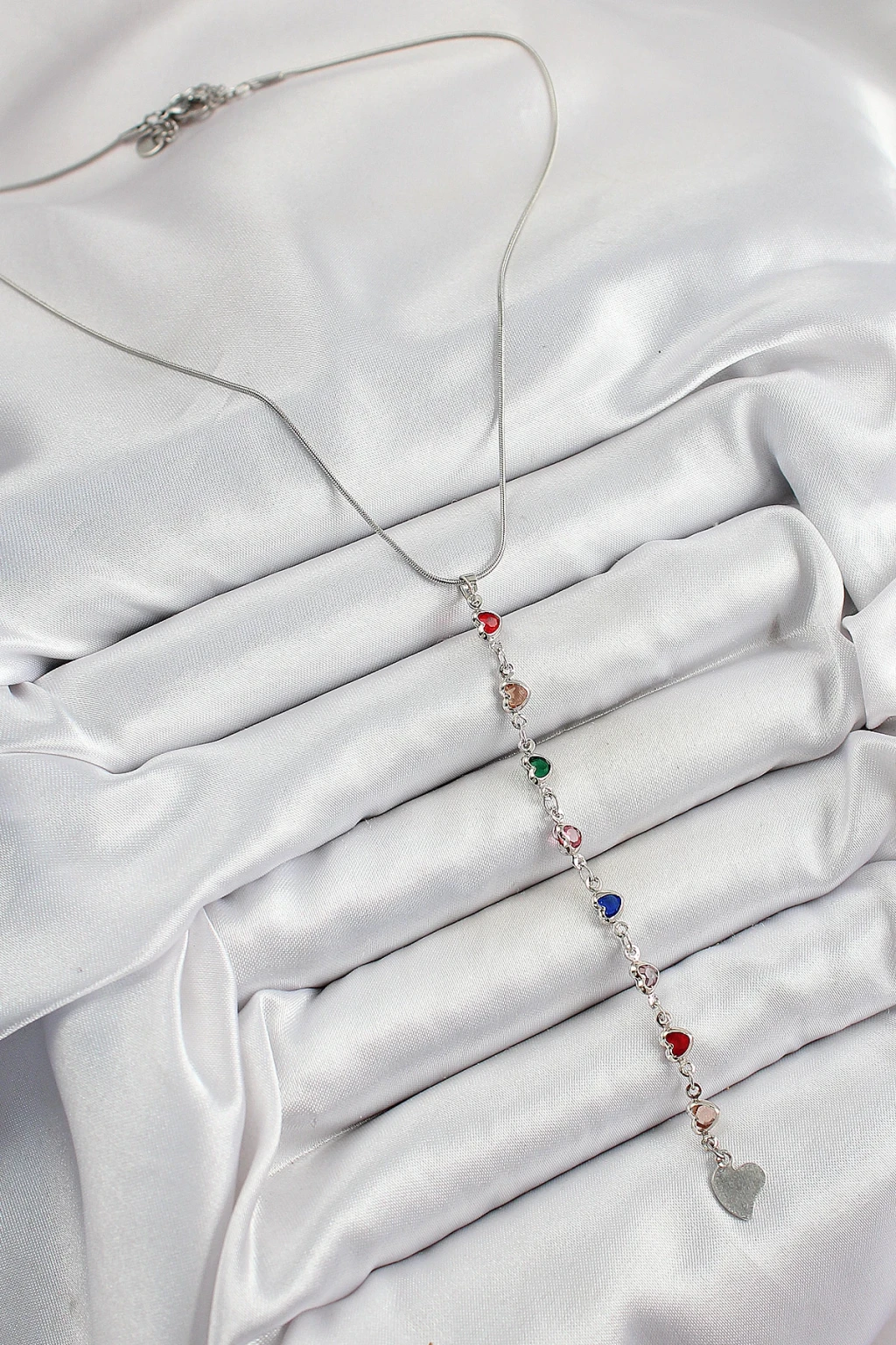Pirinç Gümüş Renk Karışık Renk Zirkon Taşlı Kalpli Y Kadın Kolye - TJ-BKO10338