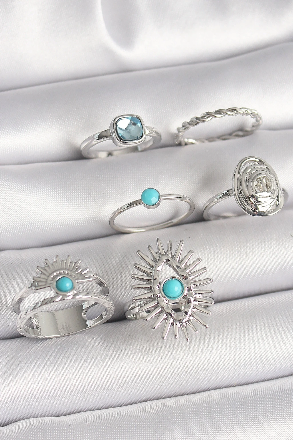 Pirinç Gümüş Renk Mavi Taşlı Kare Zirkon Taş Detaylı Kadın Yüzük Kombini - TJ-BYK3659
