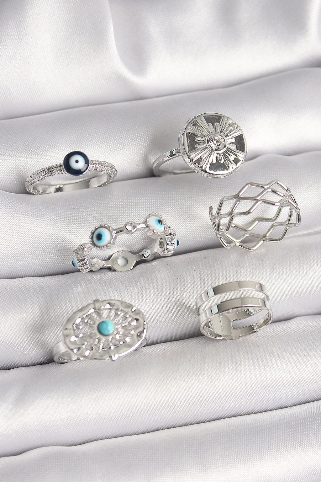 Pirinç Gümüş Renk Nazar Boncuk Zirkon Taş Detaylı Dalga Figür Kadın Yüzük Kombini - TJ-BYK3653