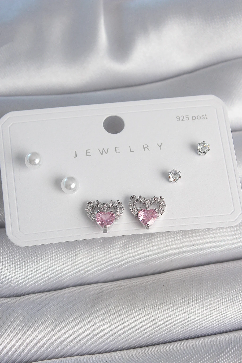 Pirinç Gümüş Renk Pembe Zirkon Taşlı Kalp Model İnci Detay 925 Ayar Gümüş Çivi Kadın Küpe Seti - TJ-BKP10489
