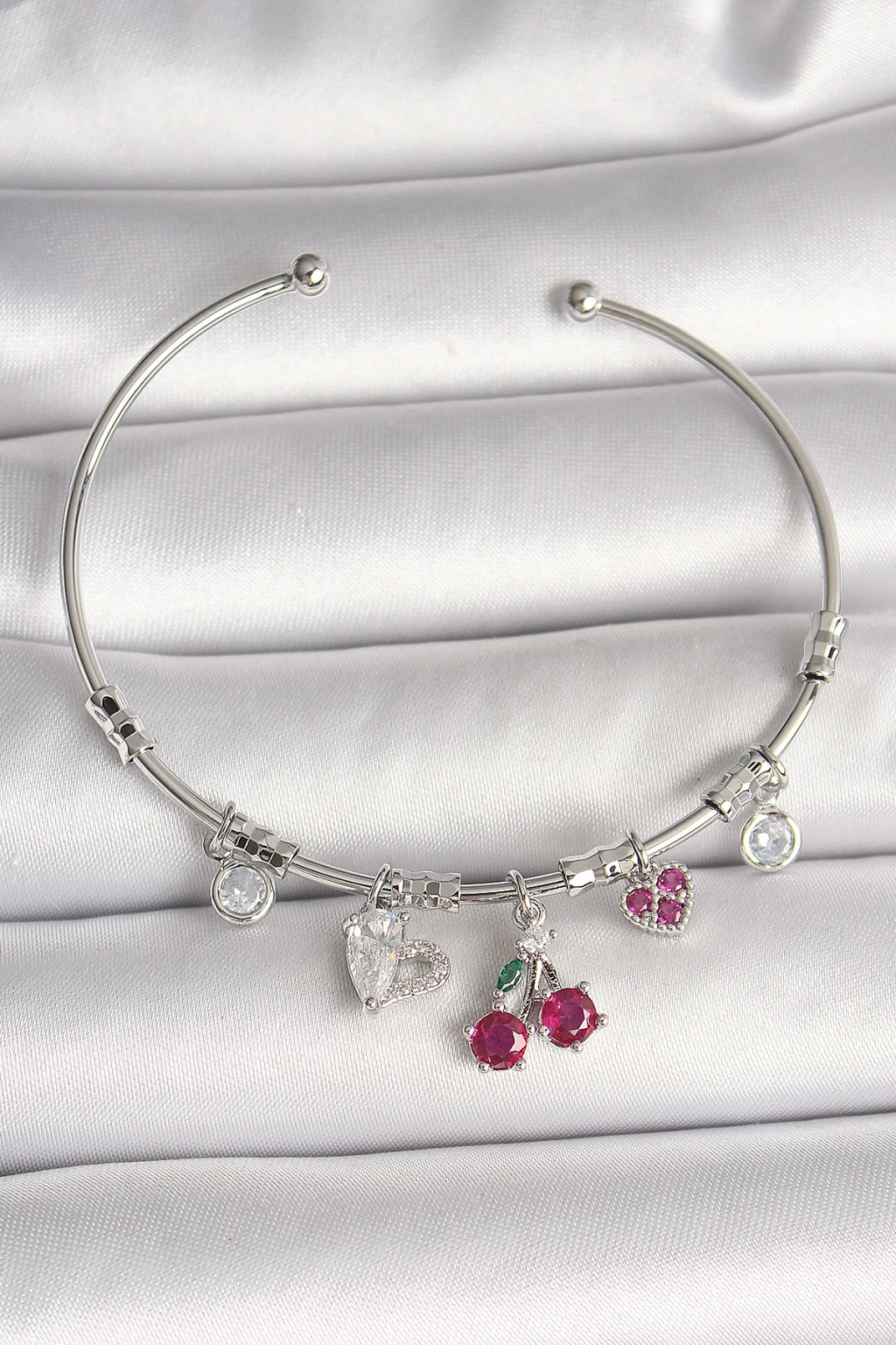 Pirinç Gümüş Renk Sallantı Kiraz Figür Kalp Detay Charm Kadın Bileklik - TJ-BB6901