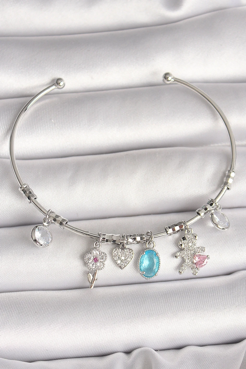 Pirinç Gümüş Renk Sallantı Zirkon Taşlı Ayıcık Figür Çiçek Detay Charm Kadın Bileklik - TJ-BB6908