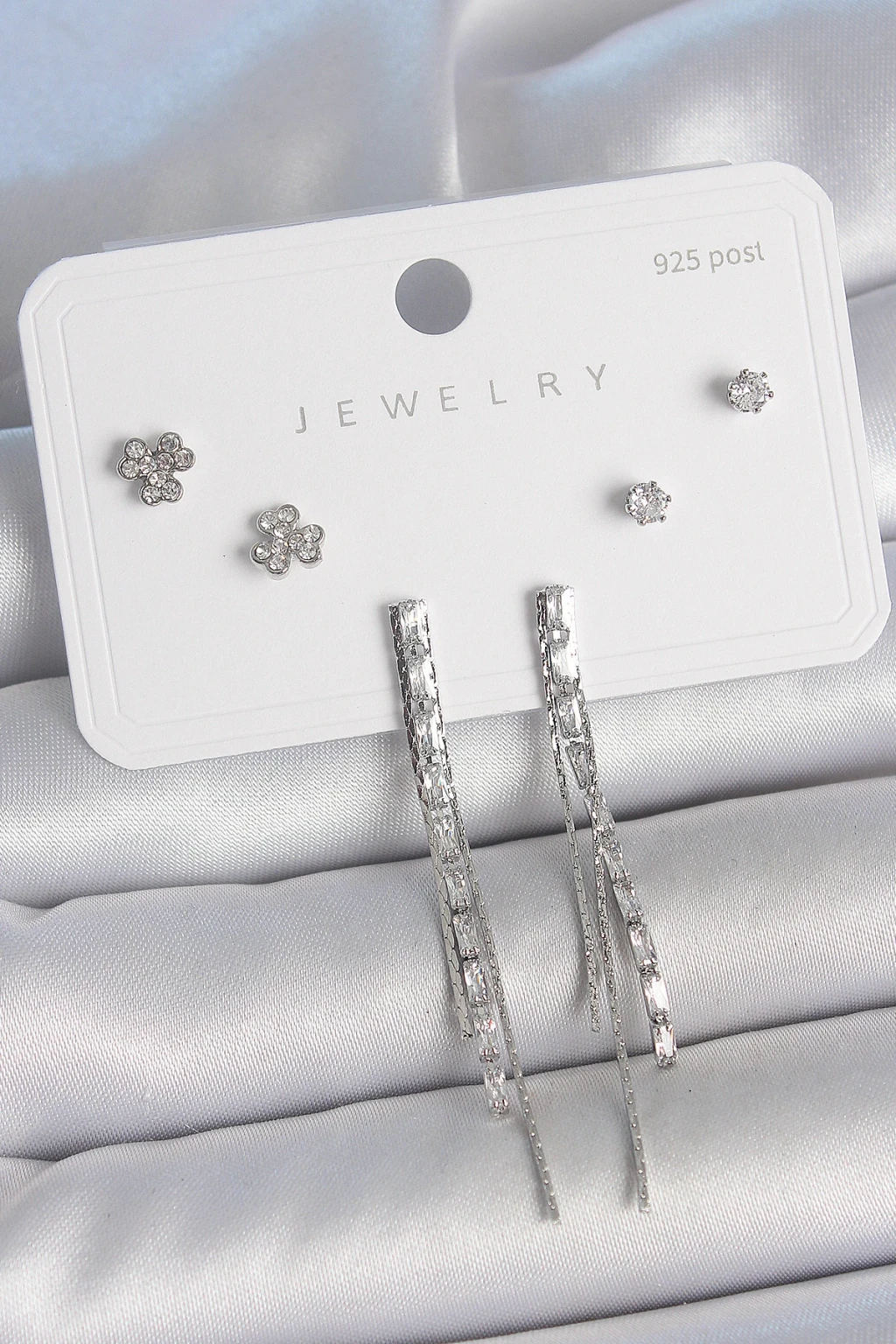 Pirinç Gümüş Renk Su Yolu Zirkon Taşlı Sallantı Model Çiçek Detay 925 Ayar Gümüş Çivi Kadın Küpe Seti - TJ-BKP10491