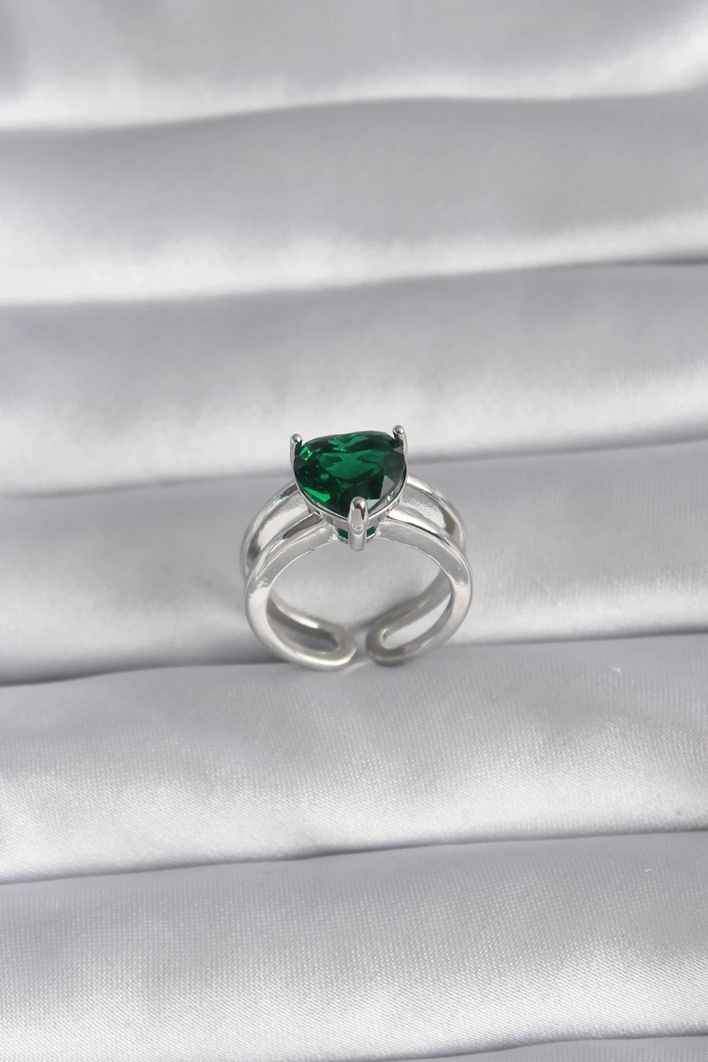 Pirinç Gümüş Renk Yeşil Zirkon Taşlı Tek Taş Model Kadın Yüzük - TJ-BYK3026