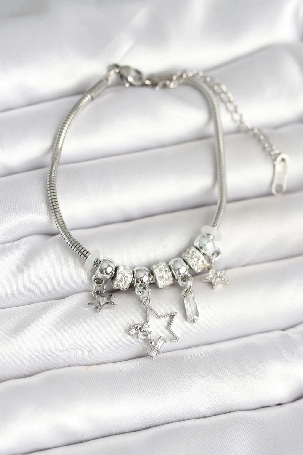 Pirinç Gümüş Renk Yıldız Charmlı Kadın Bileklik - TJ-BB7994