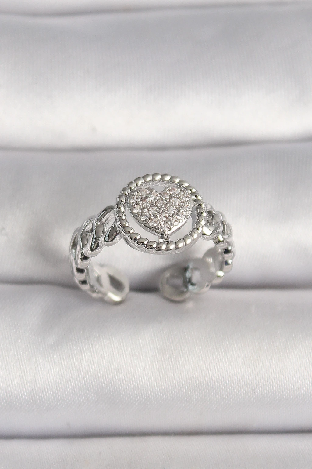 Pirinç Gümüş Renk Zincir Model Zirkon Taşlı Kalp Model Kadın Yüzük - TJ-BYK3587