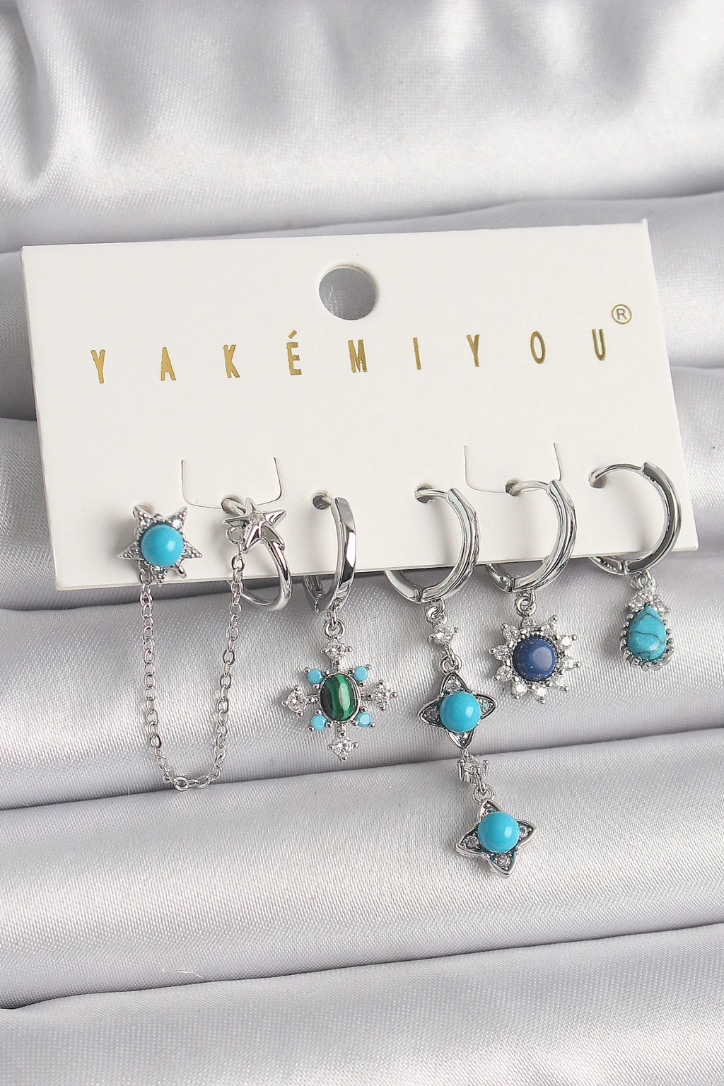 Pirinç Gümüş Renk Zirkon Taş Detaylı Mavi Boncuklu Çiçek Model VIP Seri Kadın Küpe Kombini - TJ-BKP10055