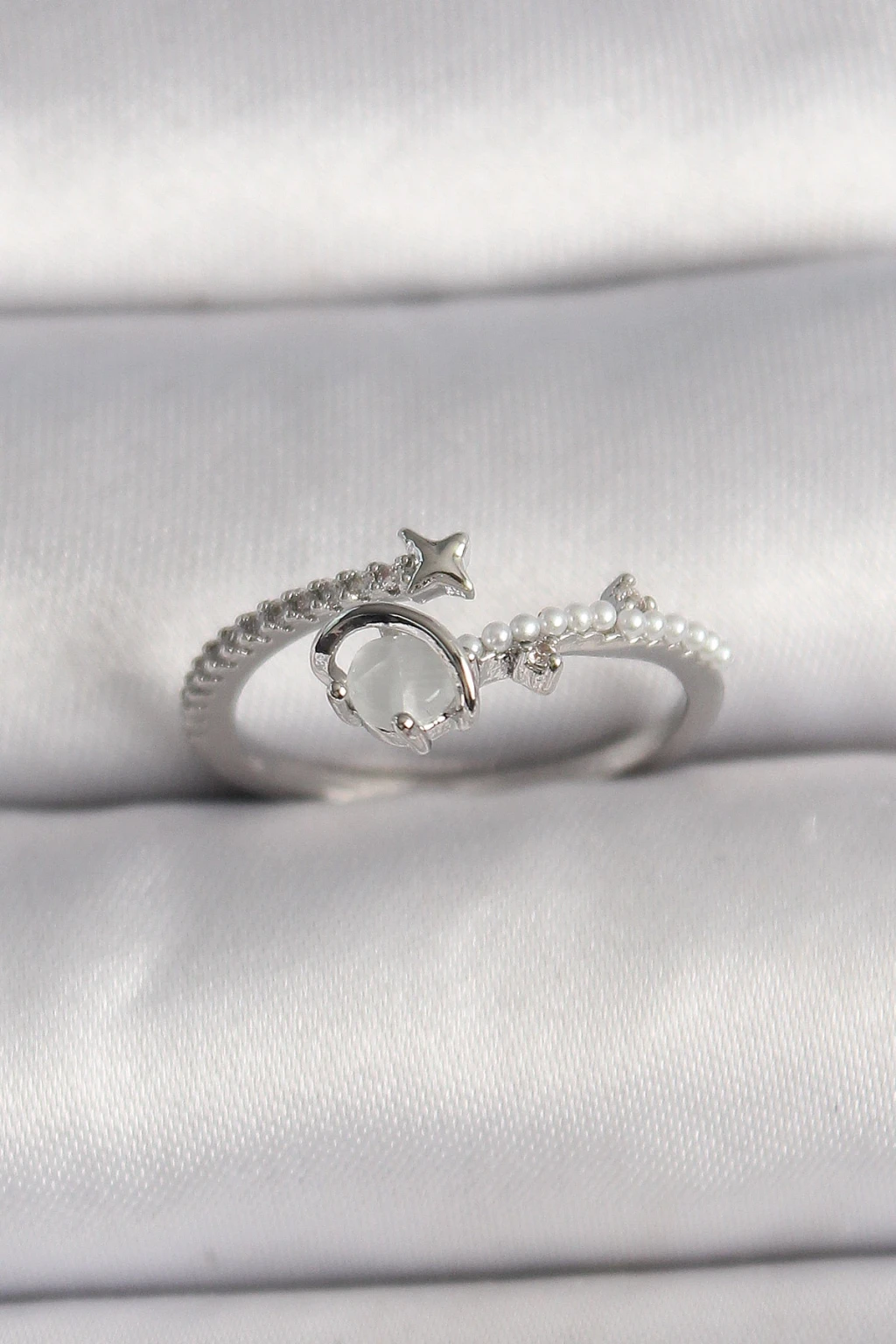 Pirinç Gümüş Renk Zirkon Taşlı Beyaz Mineli Yıldız Detay Ayarlanabilir Kadın Yüzük - TJ-BYK3570