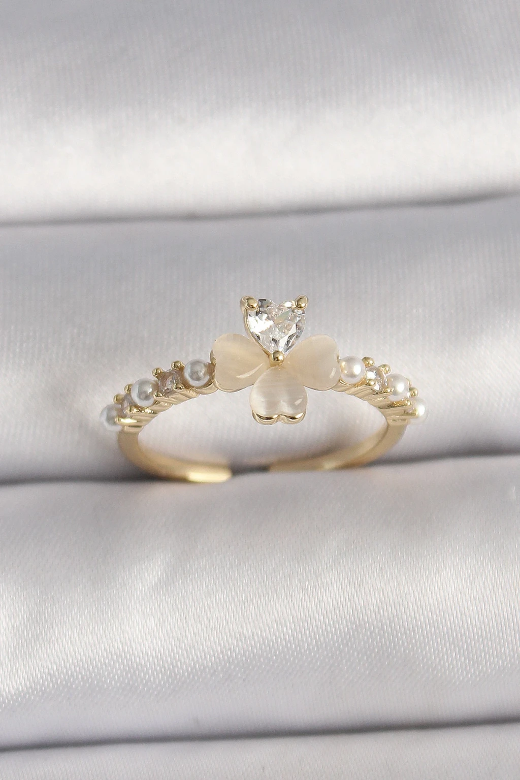 Pirinç Gümüş Renk Zirkon Taşlı Beyaz Mineli Yonca Model İnci Detay Ayarlanabilir Yüzük - TJ-BYK3551