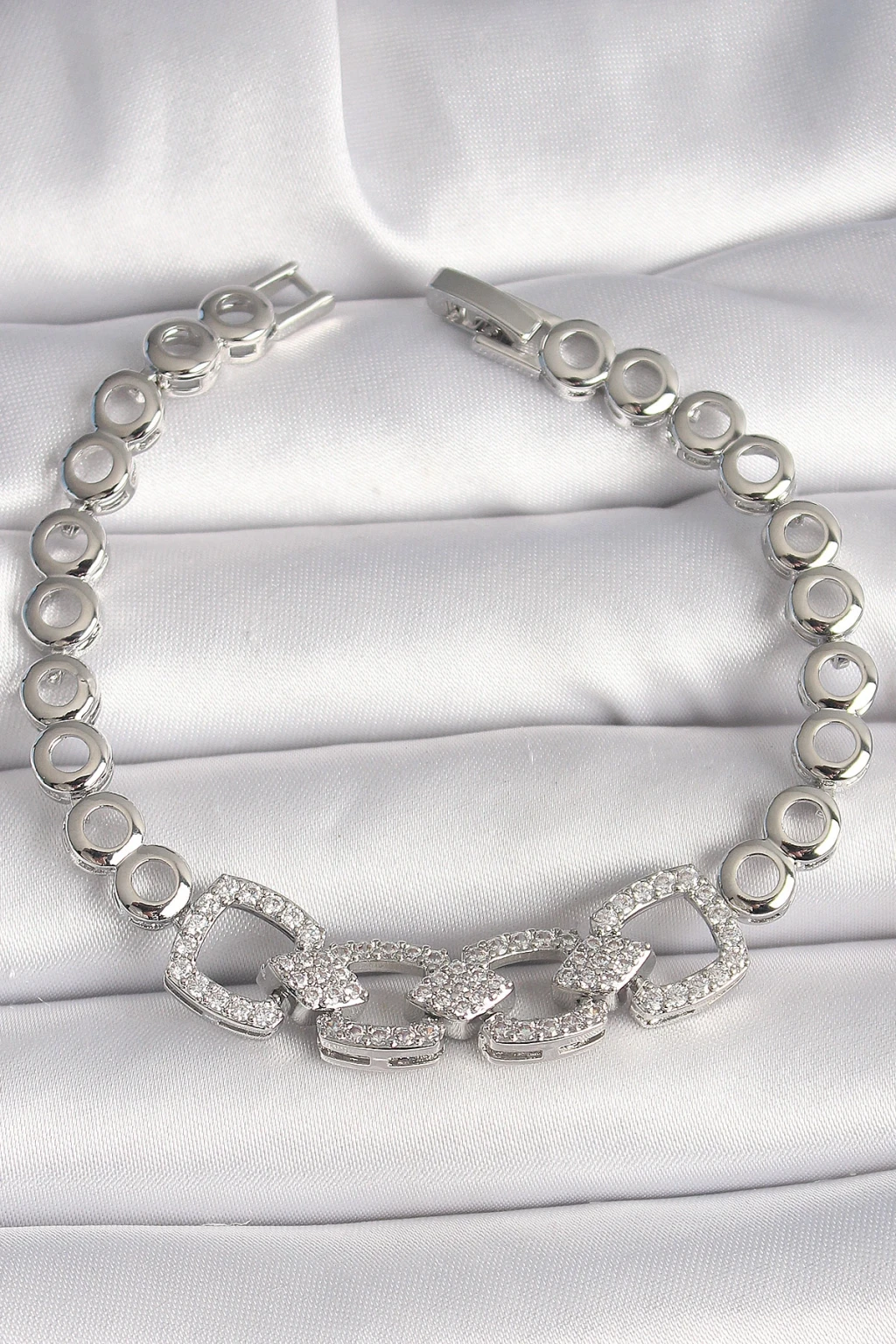 Pirinç Gümüş Renk Zirkon Taşlı Daire Zincir Model Kadın Bileklik - TJ-BB6843