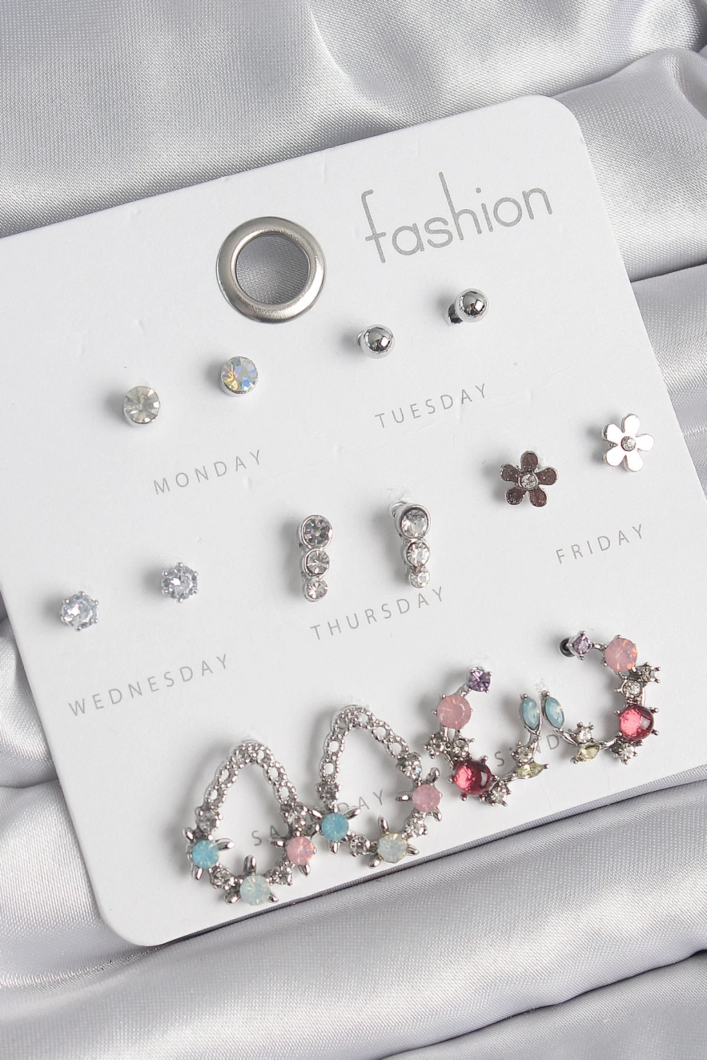 Pirinç Gümüş Renk Zirkon Taşlı Damla Model Çiçek Detay 7 Çift Kadın Küpe Seti - TJ-BKP10549